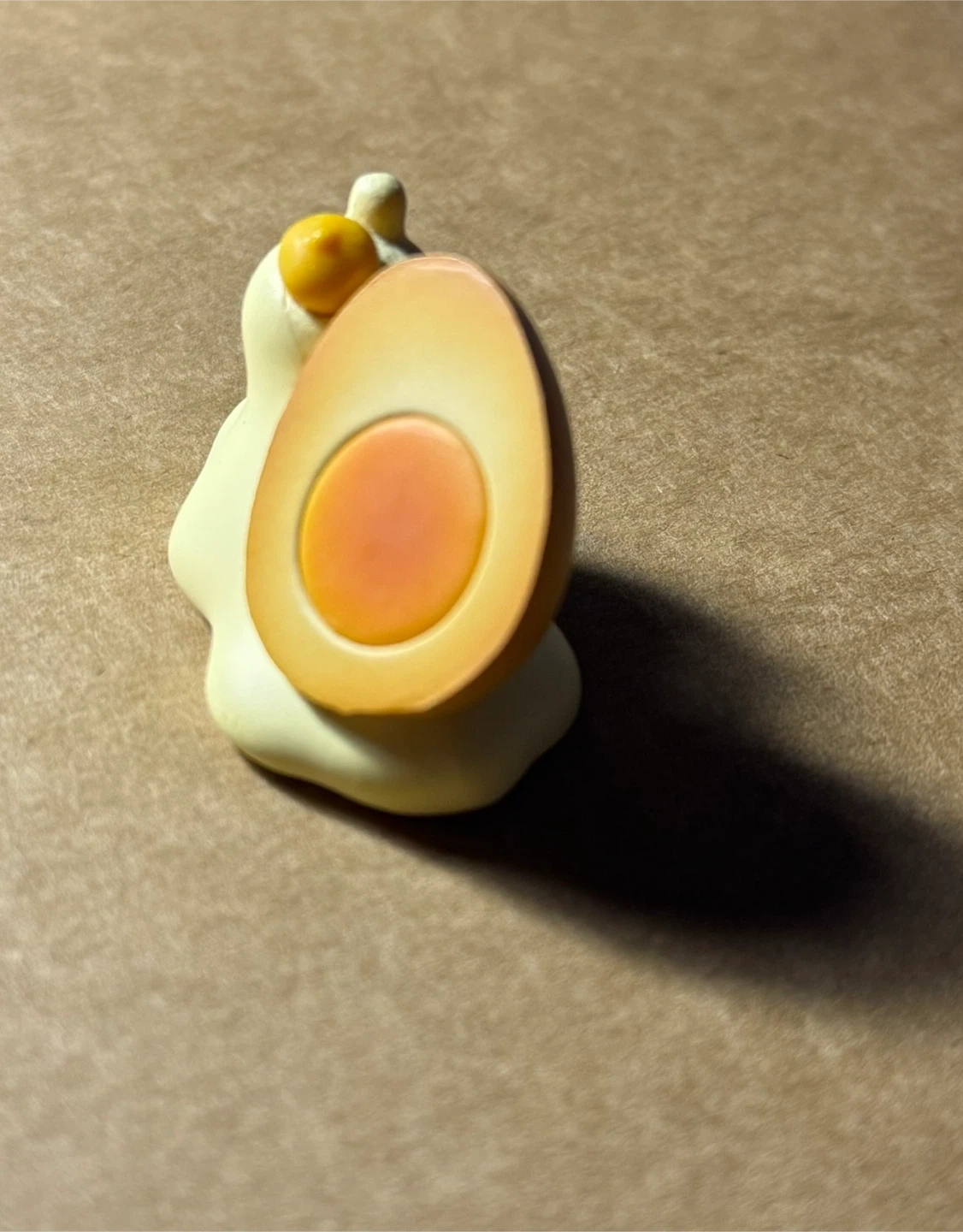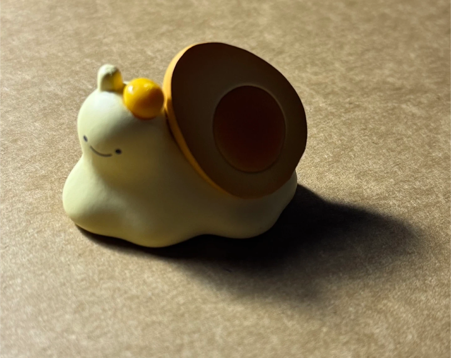 This is a cute little figurine of a snail with a shell resembling a boiled egg. It's made of a smooth, matte material and features a friendly smiling face. It would make a fun desk accessory or a small collectible item!