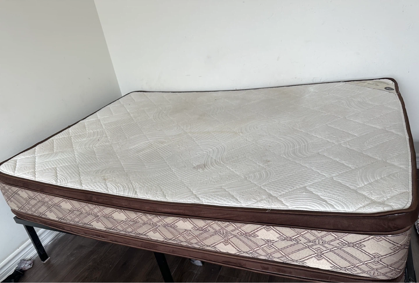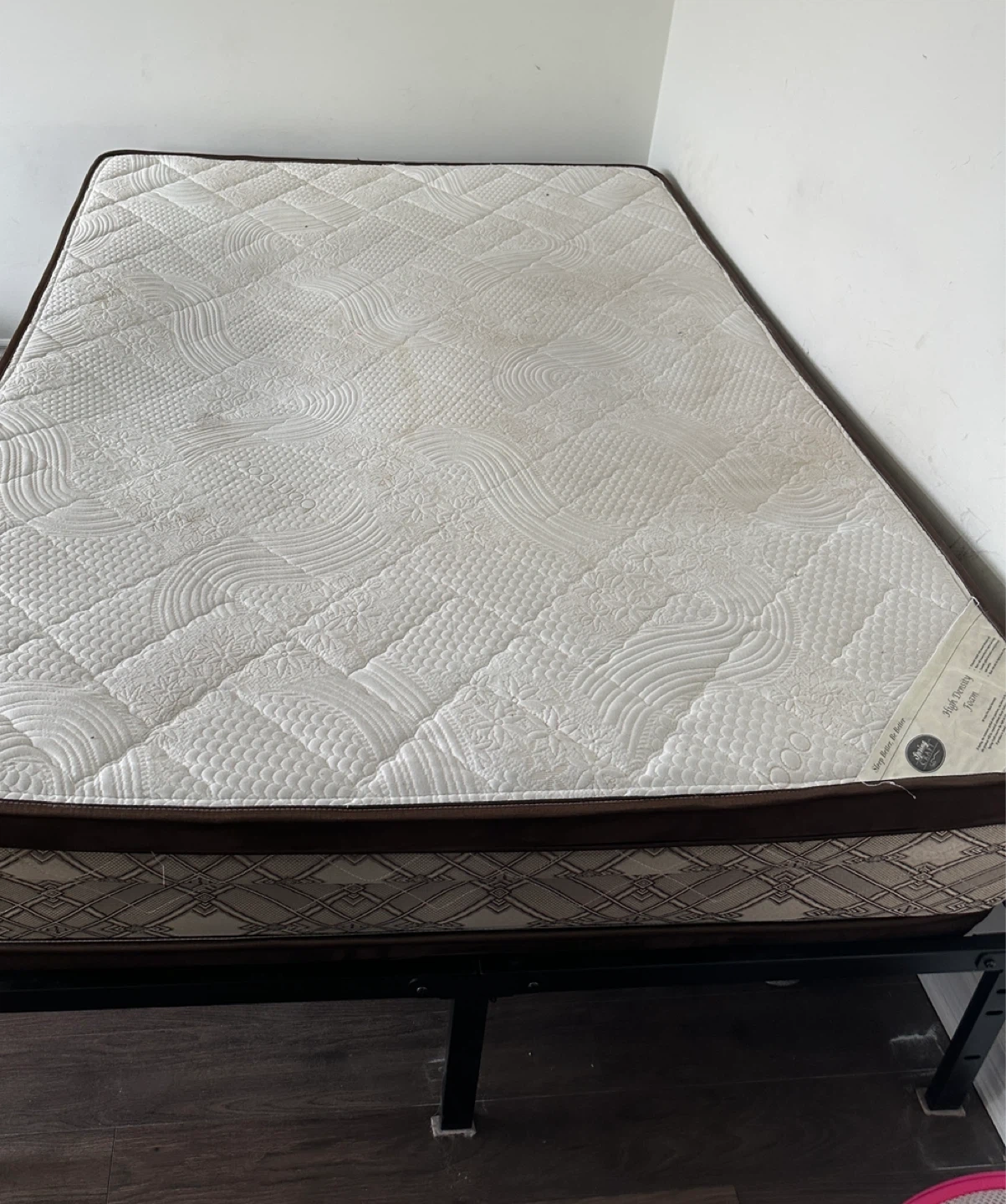 This is a Spring Craft high-density foam double mattress. It’s in okay condition. Alongside the double bed frame which is in likely new condition.