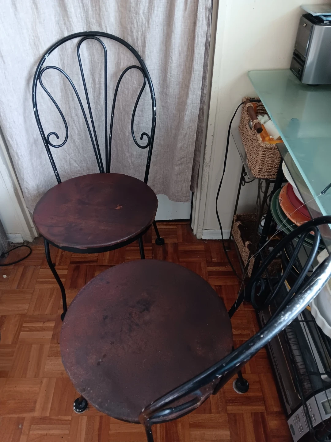 Two bistro-style chairs with black metal frames and ornate backs. The seats are round and made of wood/covered with leather. These chairs would be lovely for a small kitchen nook or balcony. Needs a bit of touch up black paint.