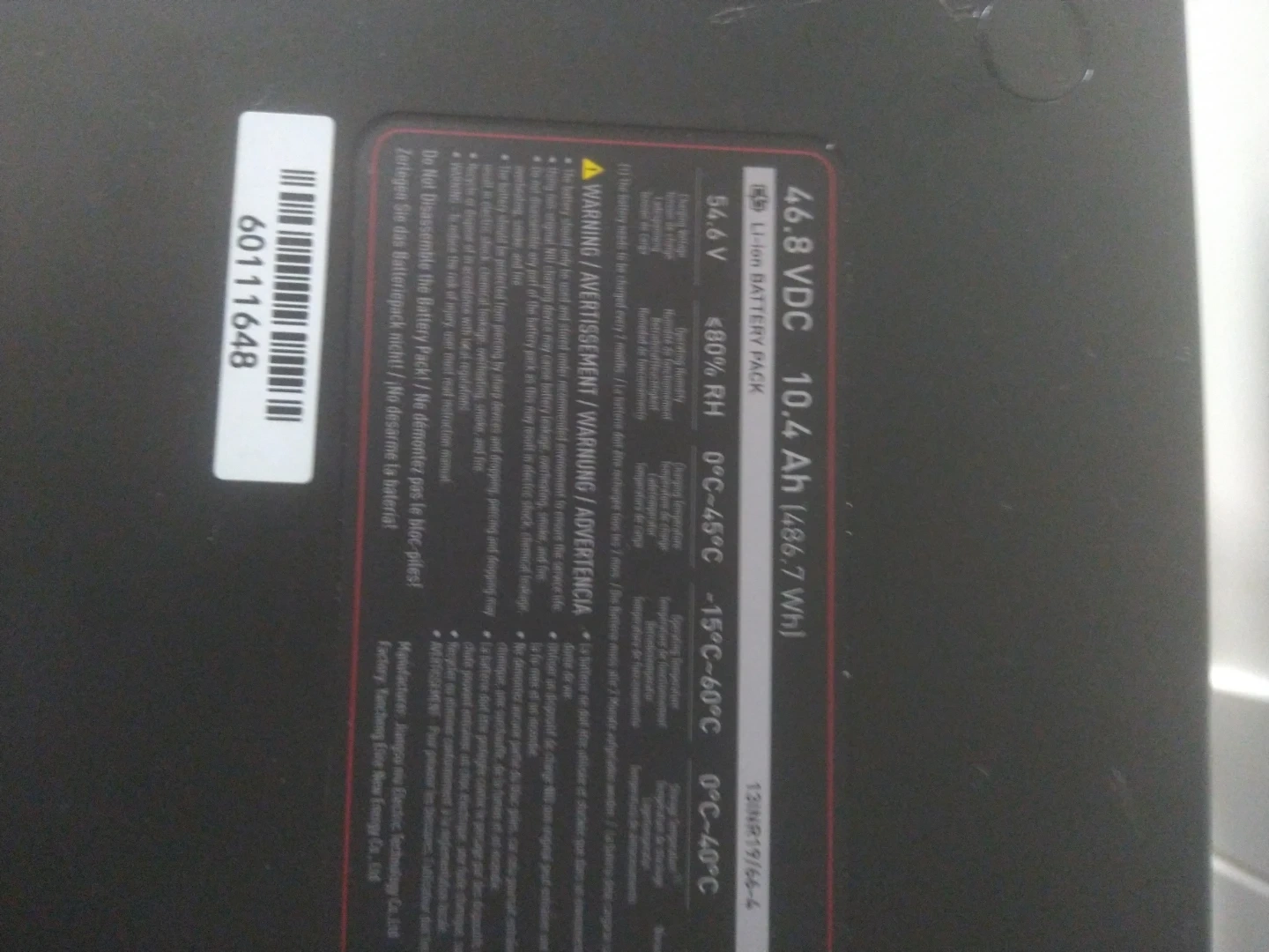 Selling a 48VDC 10.4 Ah (486.7 Wh) Li-ion Battery Pack. It operates between 54.6 V and has a storage condition of <80% RH.