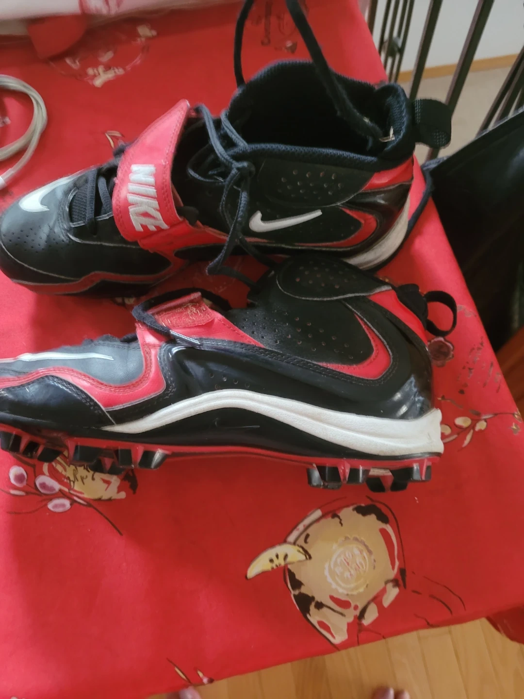 Nike baseball cleats in black and red. Lace closure with a velcro strap for a secure fit. Cleated soles for traction on the field. It's a pair of athletic shoes for sports.