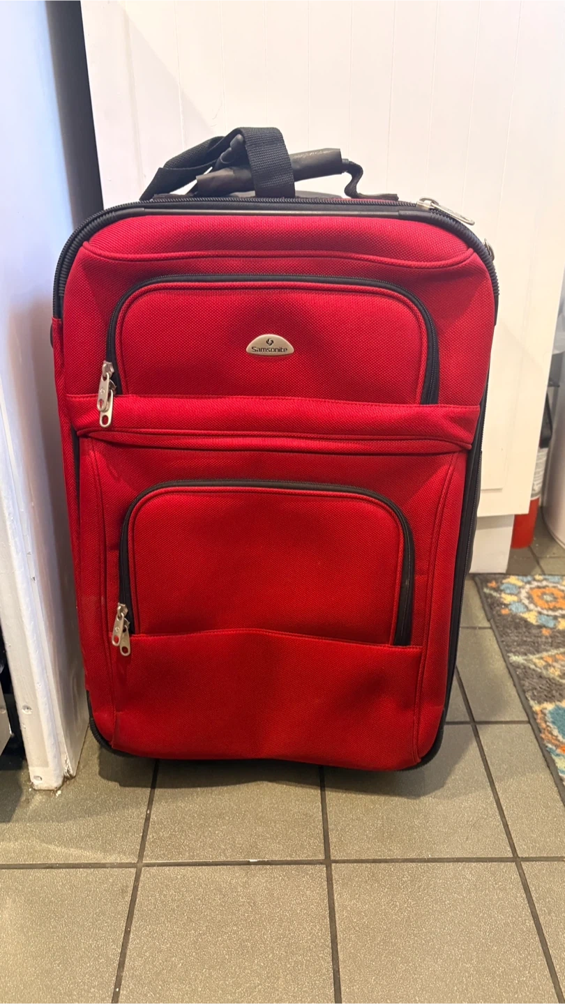 This is a new Samsonite red spinner luggage. It's a hard-shell suitcase with a durable fabric exterior and two large zippered compartments inside. This would be great for travel!