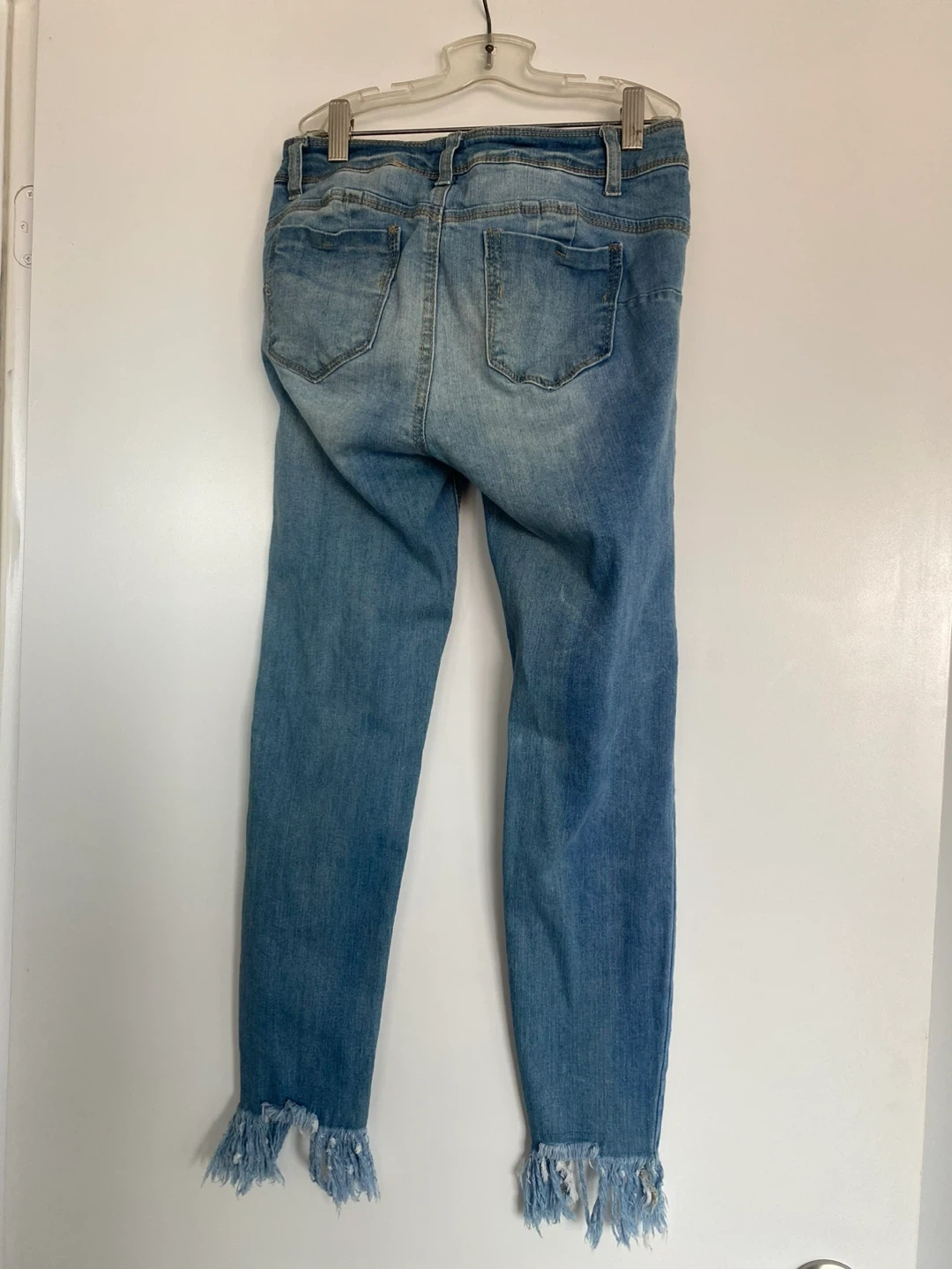 These are Forever 21 blue denim jeans with a distressed look and frayed hems. They're a size 27 in US sizing. Perfect for casual wear!