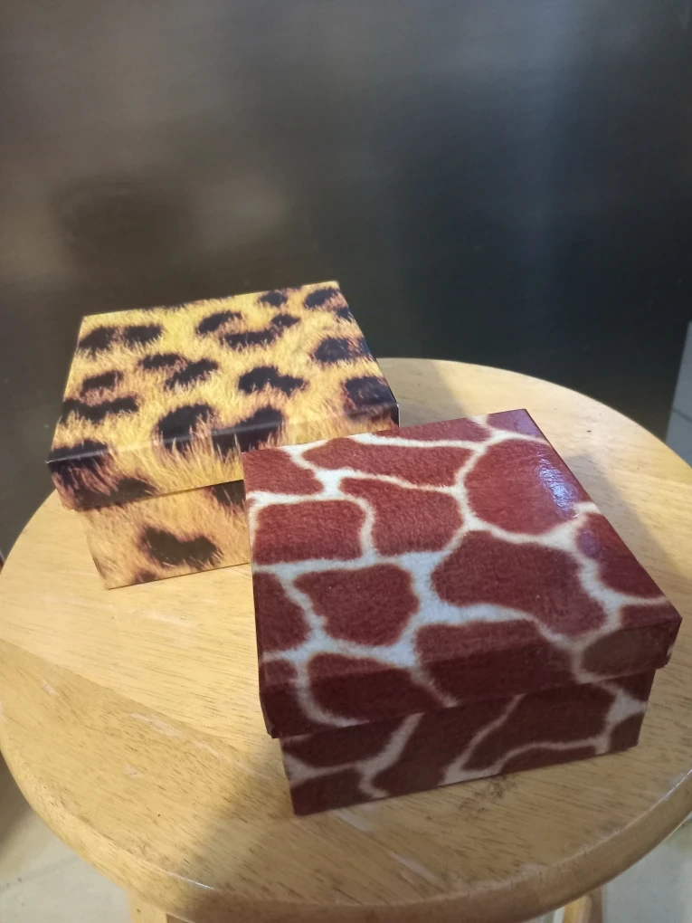 Selling a set of two decorative boxes with animal prints! One has a giraffe print and the other a leopard print. They're perfect for storing small items or as part of your home decor