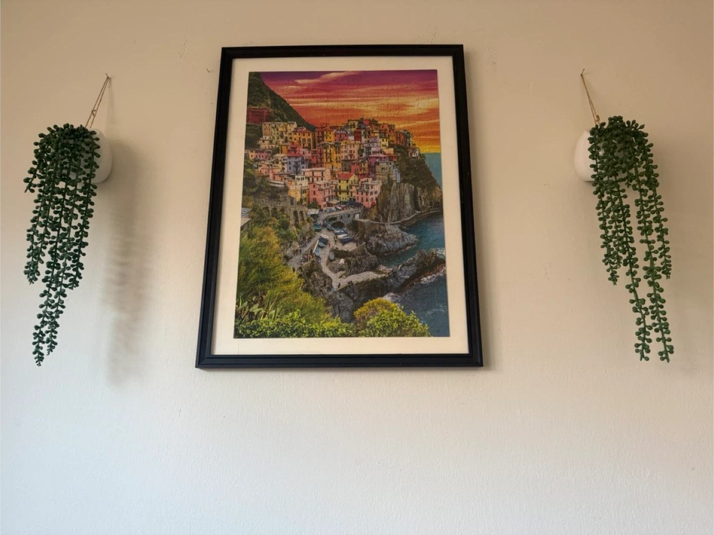 A black photo frame. It's a simple, utilitarian frame ready for your pictures. This frame is suitable for displaying artwork or photographs. 19.25" x 25.25" (jigsaw puzzle picture and plants sold separately)