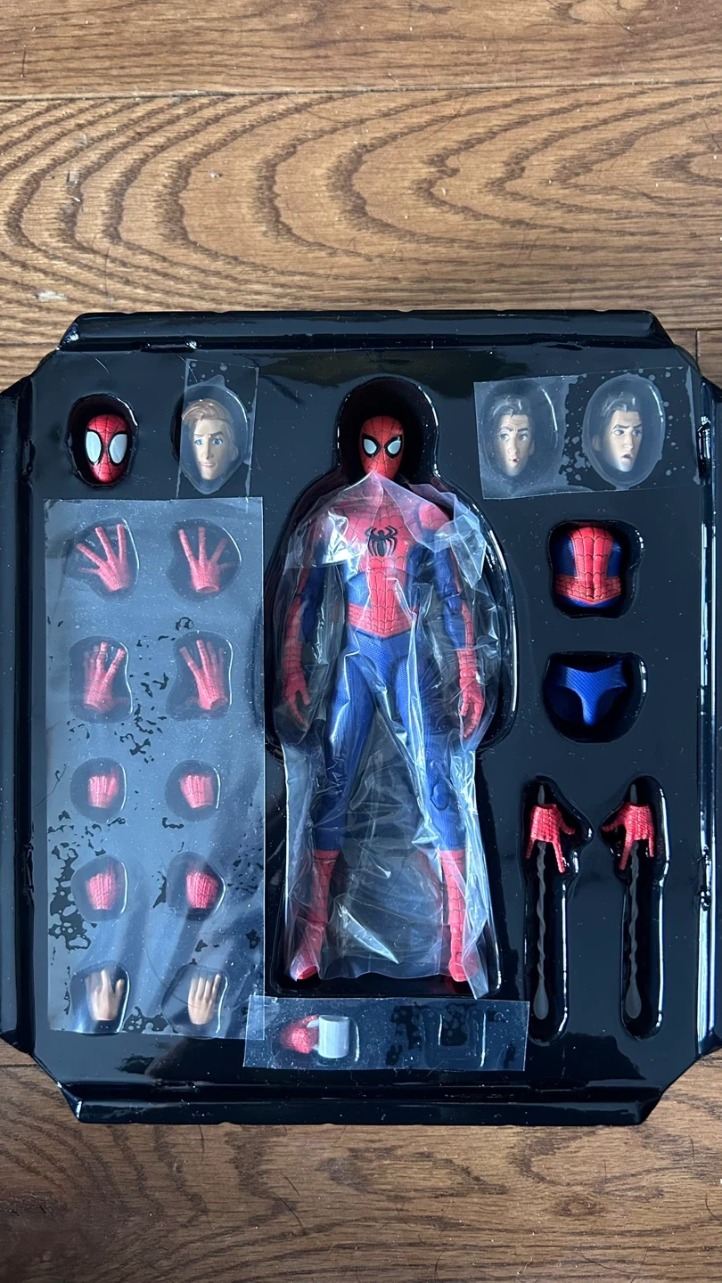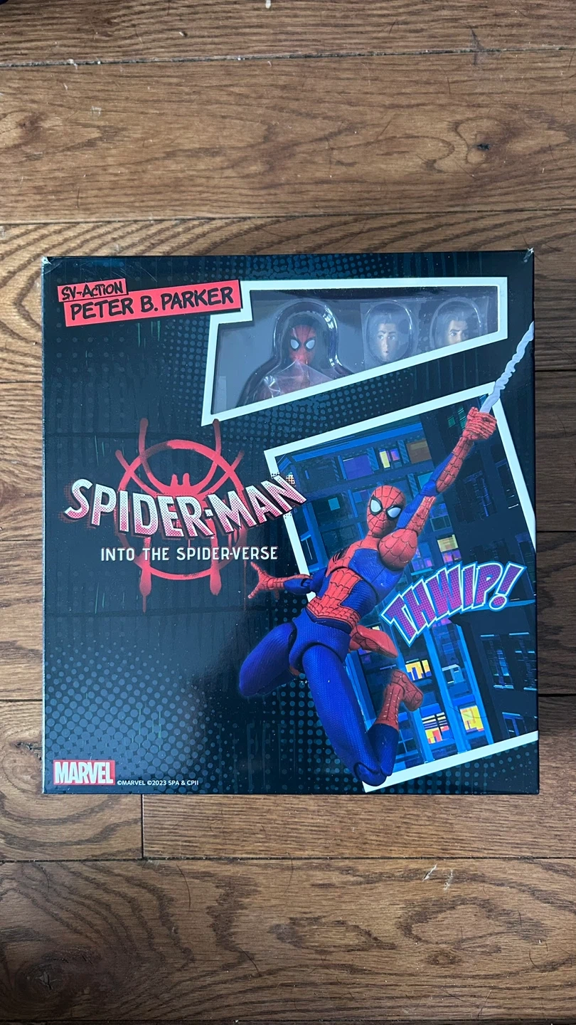 This is a Sentinel Marvel's Spider-Man action figure, Peter B. Parker, from the Into the Spider-Verse movie. It comes with multiple interchangeable hands, heads, and accessories. Great for any Marvel collector!