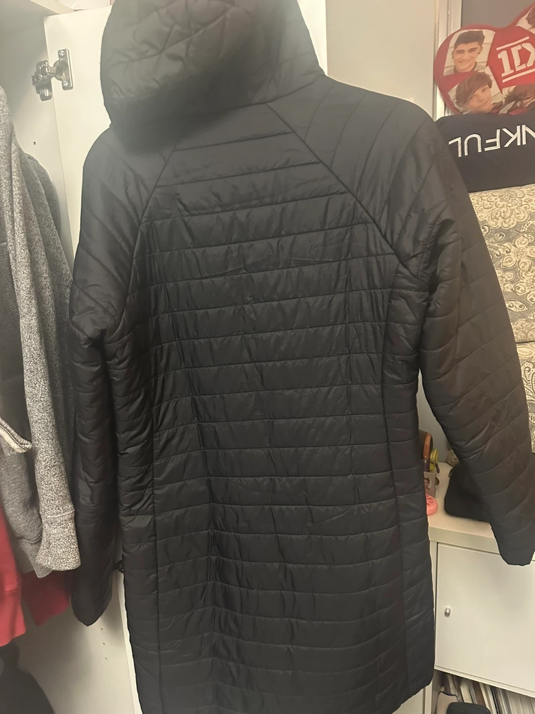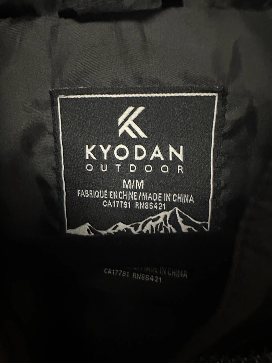Kyodan Outdoor quilted puffer jacket. It's a women's size medium in black. Features a full zip front and hood.