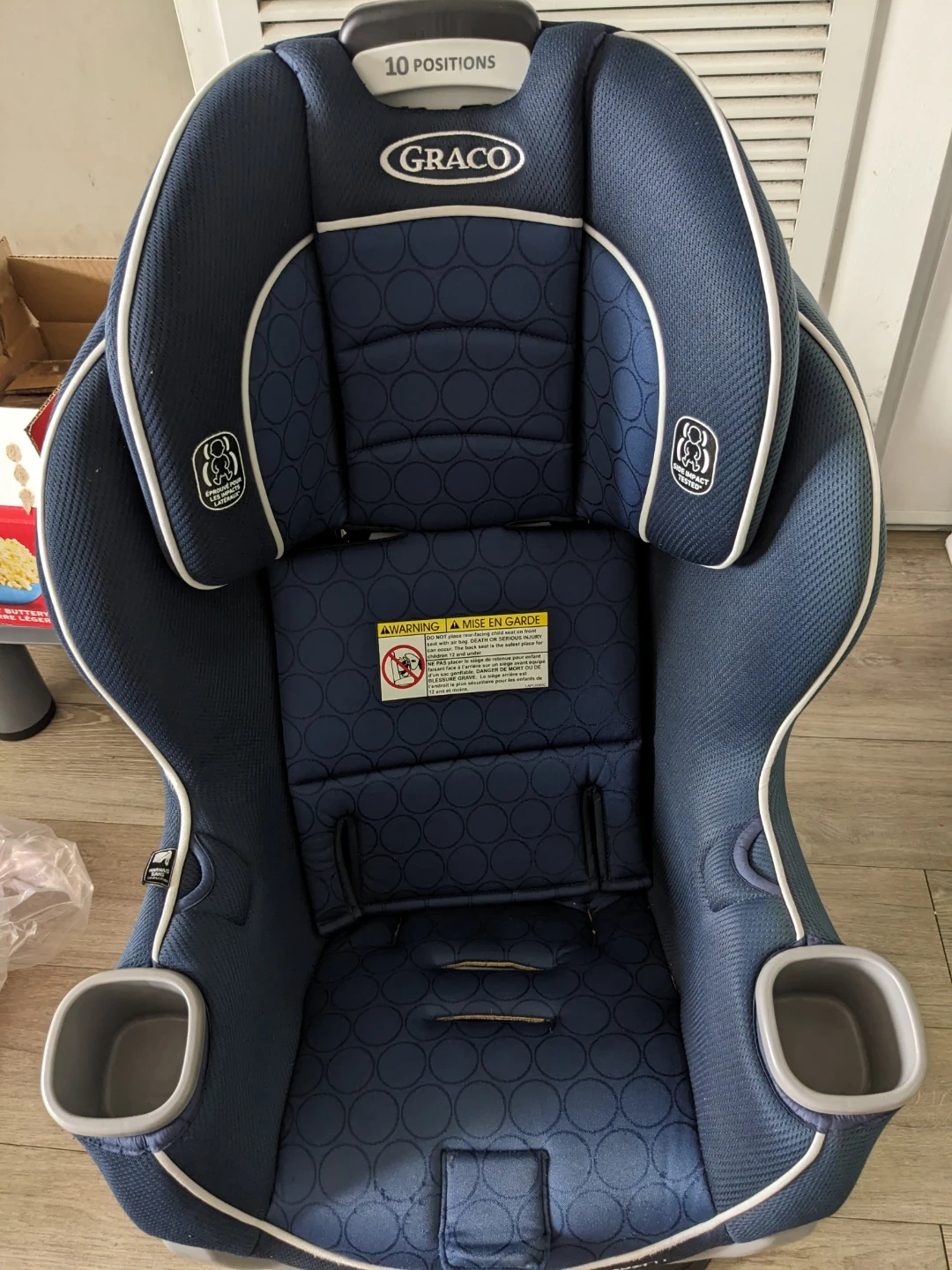 This Graco convertible car seat has 10 positions for adjustability. It's a dark navy colour with contrasting white piping. Features dual cup holders on the sides.