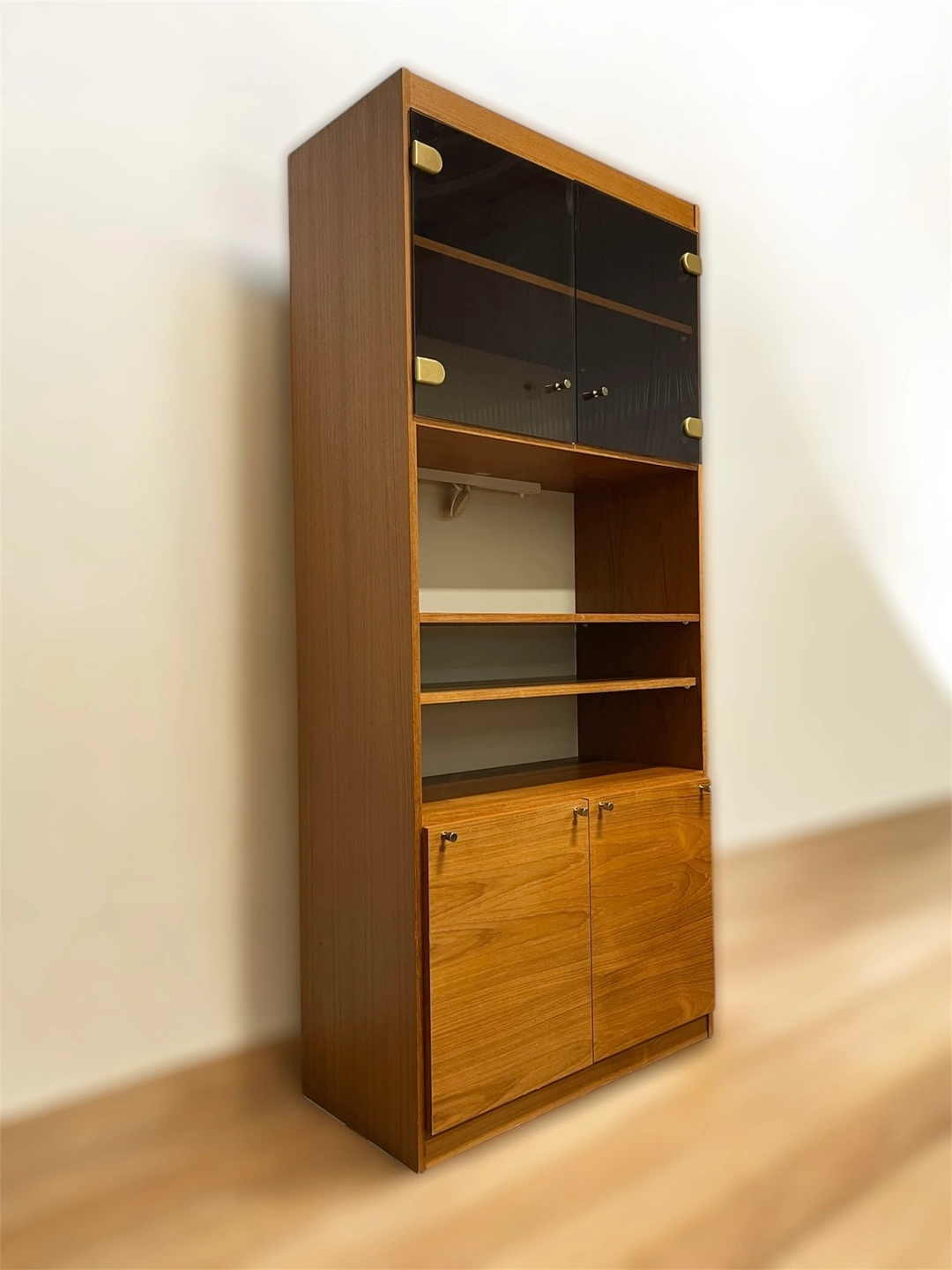 Produced in teak wood veneer, this minimalist and narrow cabinet has a sleek shape, with smoked plexi glass doors and concealing storage below. This cabinet is a very versatile unit that can be used for a number of purposes. It is perfect for storing china/ceramics or would also be great as a bookcase and for storing your bottles and glasses etc. Three of the four shelves are removable and can be adjusted. In excellent condition. Light has been tested. The back panel features a hole to run the wire through. Made in Denmark, 1960’s.