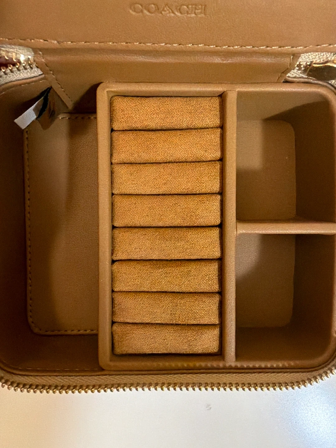 Easy great gift for your GF,wife …. This Coach jewelry box is perfect for travel. It features a signature C pattern with gold hardware. Inside, it has ring rolls and compartments for your accessories. It also includes a small mirror!