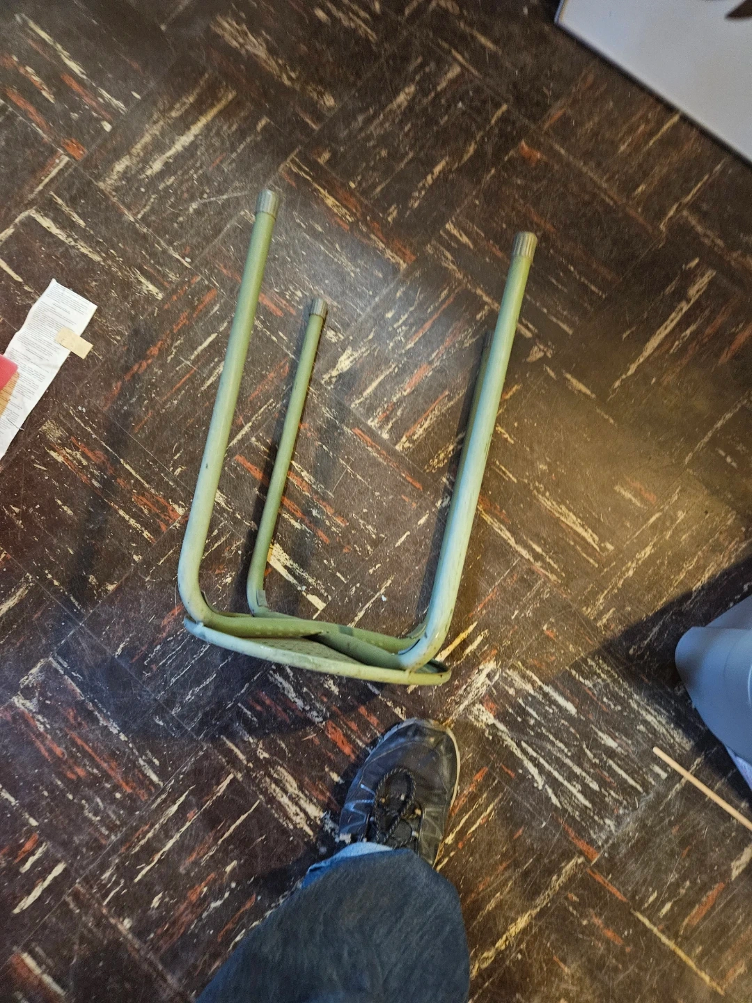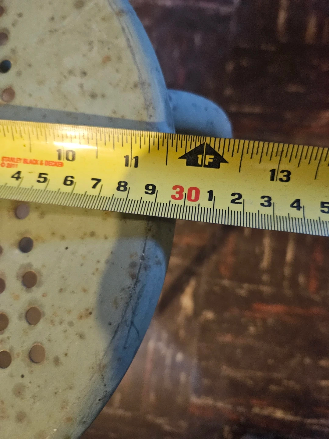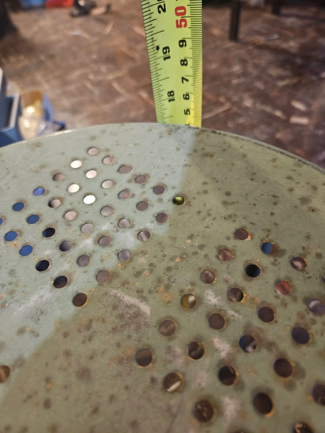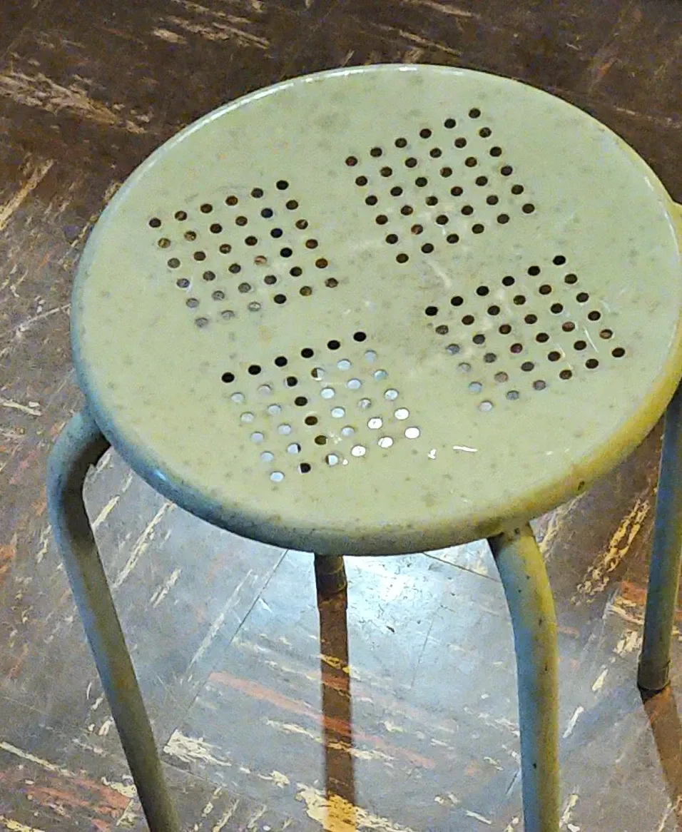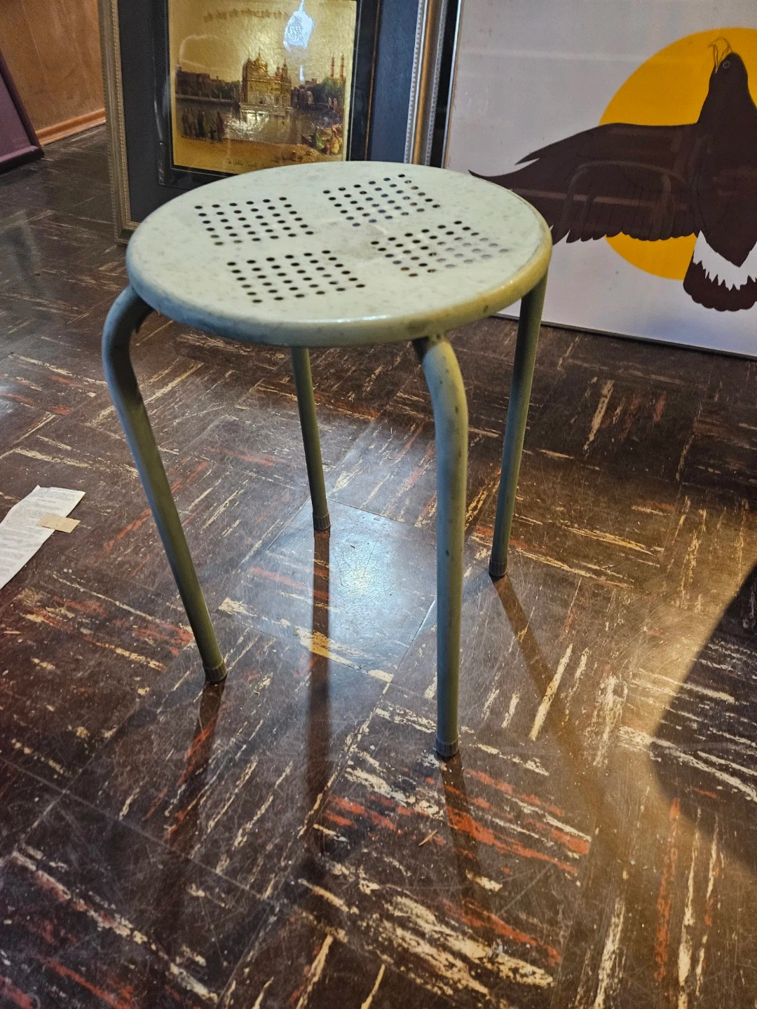 A cool, vintage stool made of perforated metal. It's light green in colour and has a unique, industrial look. Stool height is approximately 18 inches. It's perfect for a workshop or adding a retro touch to any space!