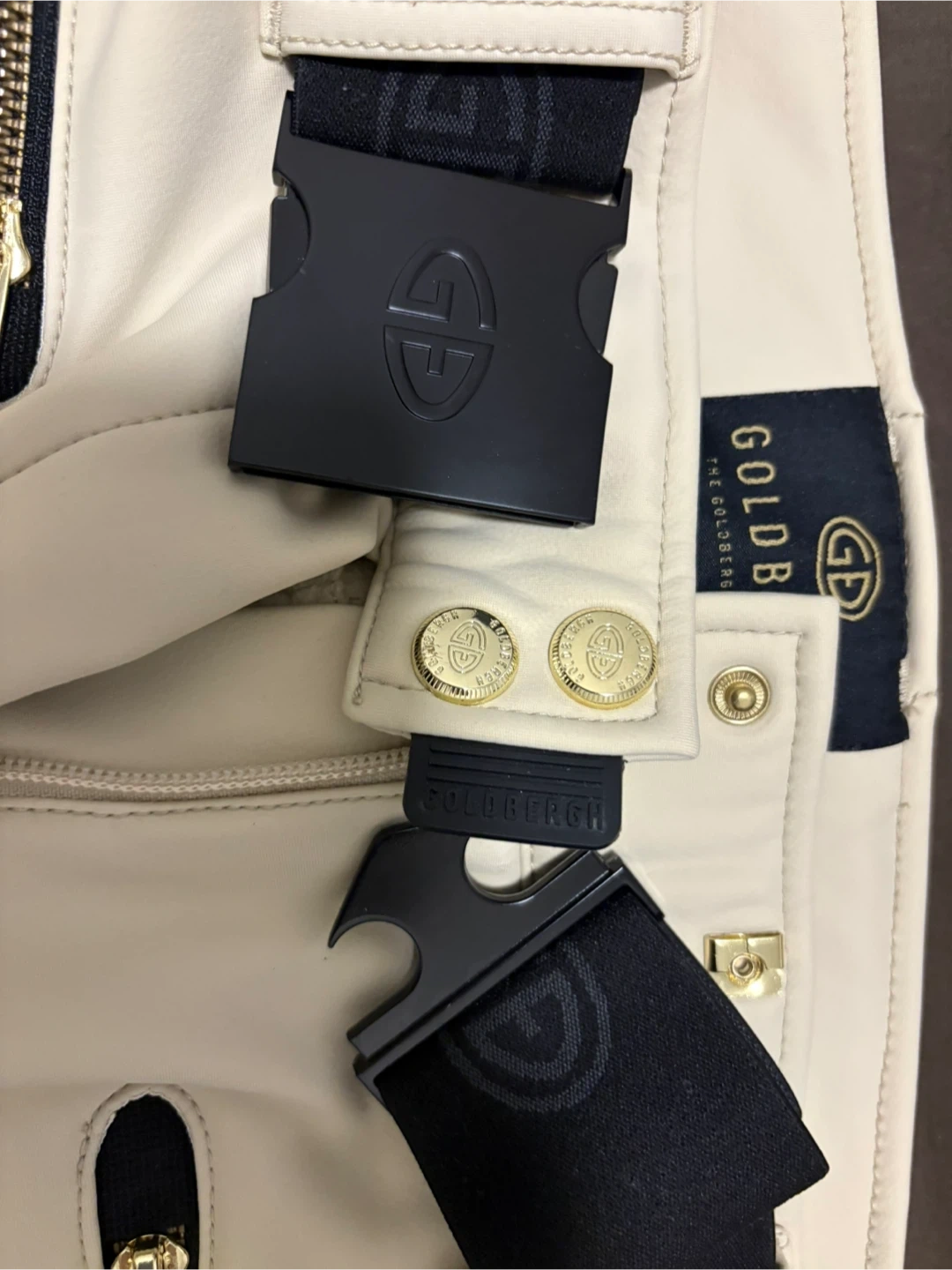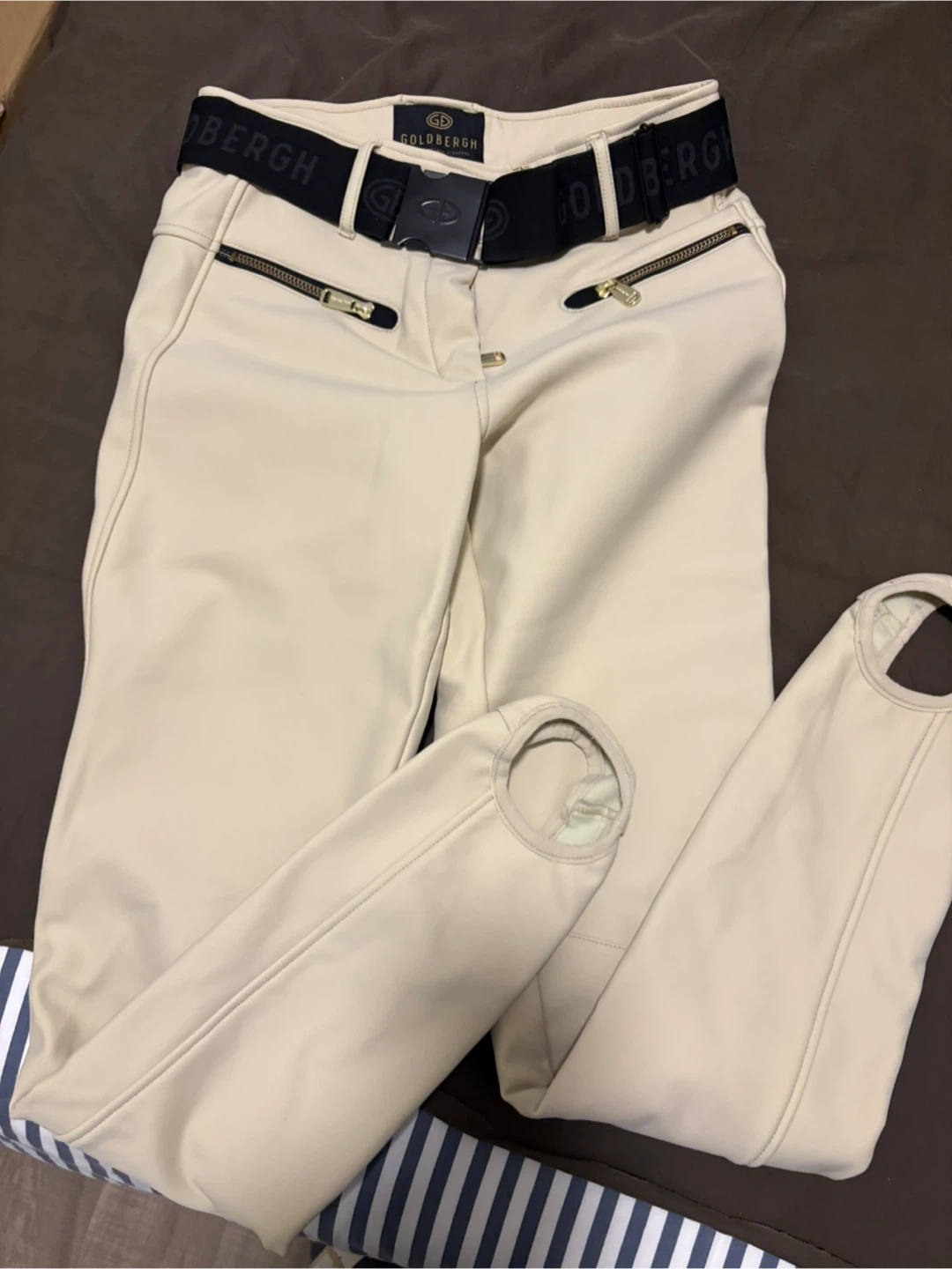 Luxury Europe brand GOLDBERGH stirrup pants in a light beige colour. Features include a branded elastic waistband with a clasp closure and zippered pockets. Made with a durable, stretchy material.
