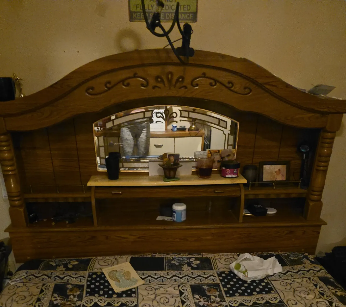 Selling a wooden headboard with a built-in mirror and shelving. It's in good condition and would be a great addition to any bedroom. It also has a light above the mirror. Check out my other listings matching dresser and mirror and armor.....
