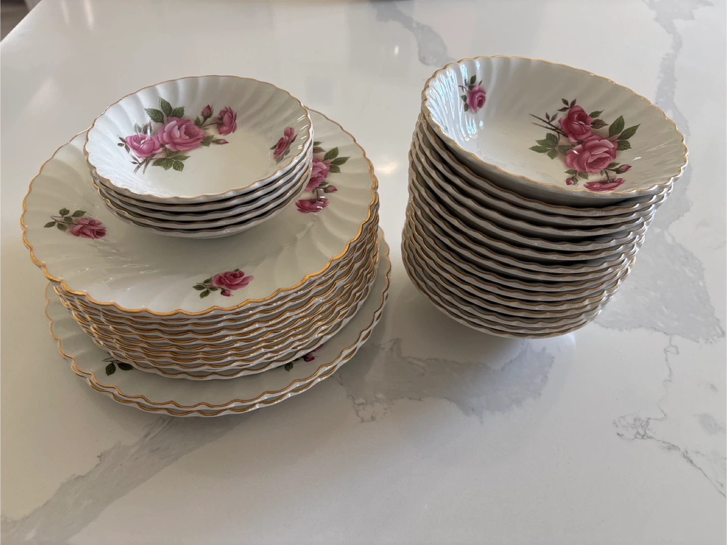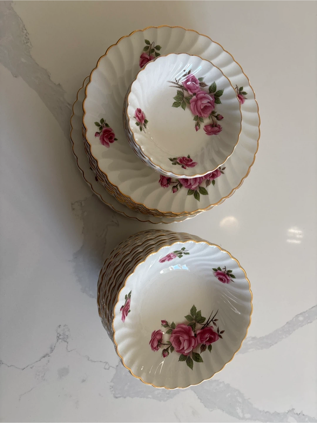 This set includes six Royal Albert dinner plates and six matching bowls. They feature a delicate rose pattern with gold trim. White ceramic material with scalloped edges. These pieces are great for special occasions or everyday elegance!