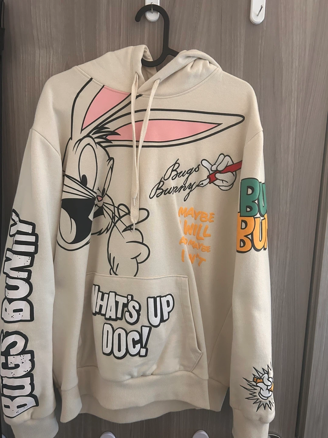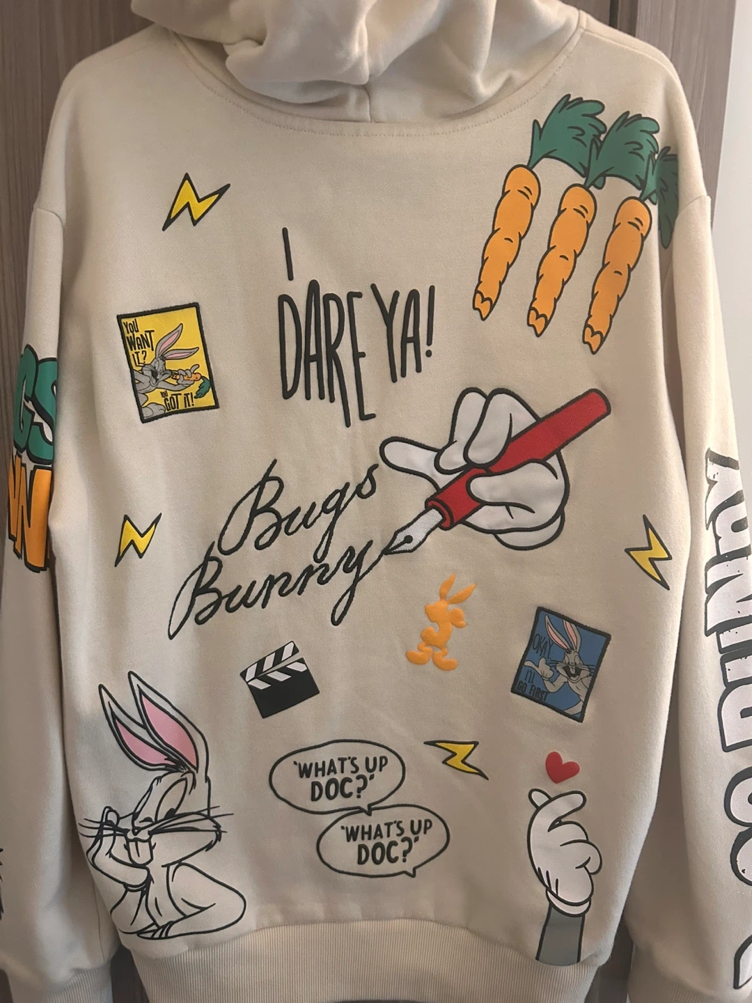 This cream-coloured hoodie features a large Bugs Bunny graphic with the phrase 'What's Up Doc?' on the front. It also has multiple smaller Bugs Bunny illustrations and cartoon elements on the back and sleeves. Made from a soft material, it's a comfy and fun addition to any wardrobe.