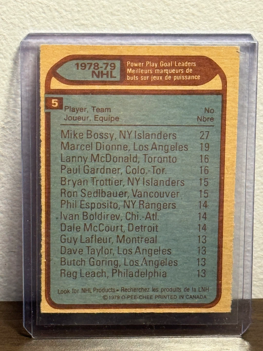Selling a 1978-79 O-Pee-Chee NHL hockey card featuring Power Play Goal Leaders. The card highlights players like Mike Bossy, Marcel Dionne, and Lanny McDonald. A great addition for any hockey card collector!
