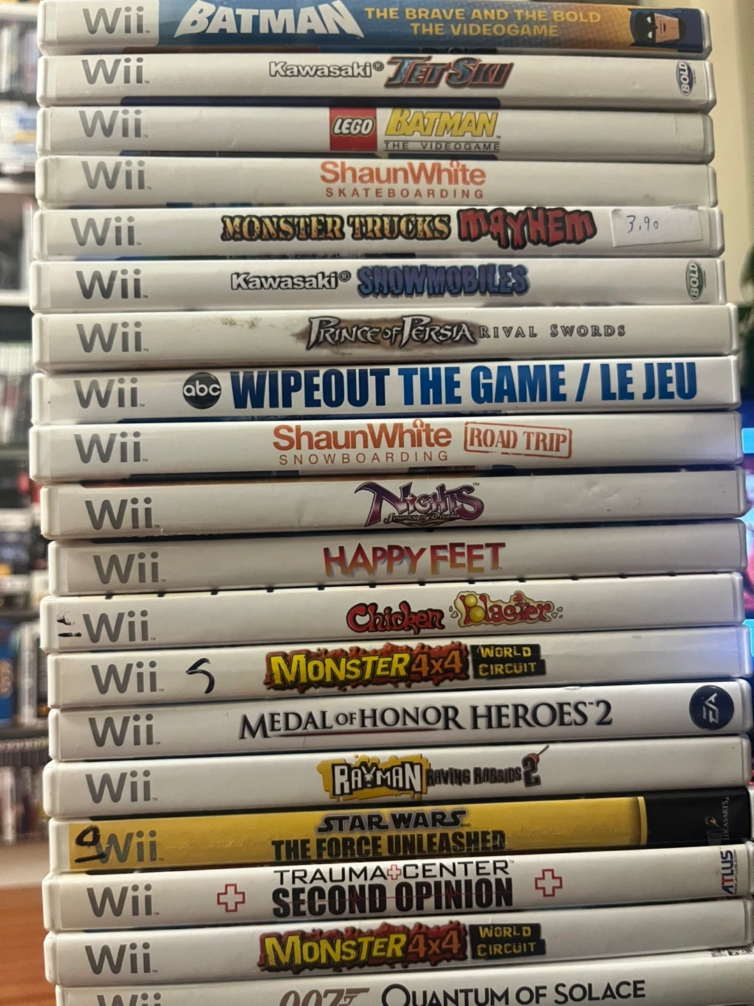 A collection of 13 Wii games including Batman, Lego Batman, Shaun White Snowboarding, Monster Trucks Mayhem, Kawasaki Snowmobiles, Prince of Persia, Wipeout, Shaun White Road Trip, Nights Journey of Dreams, Happy Feet, Chicken Little, Monster 4x4, Medal of Honor Heroes 2, Rayman Raving Rabbids, Star Wars The Force Unleashed, Trauma Center Second Opinion, and 007 Quantum of Solace. These discs are for the Wii console.