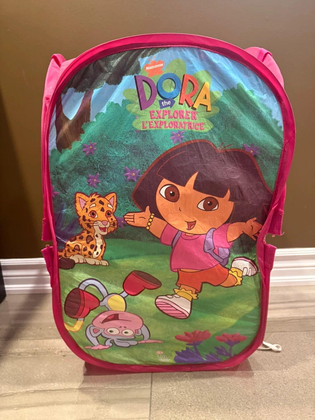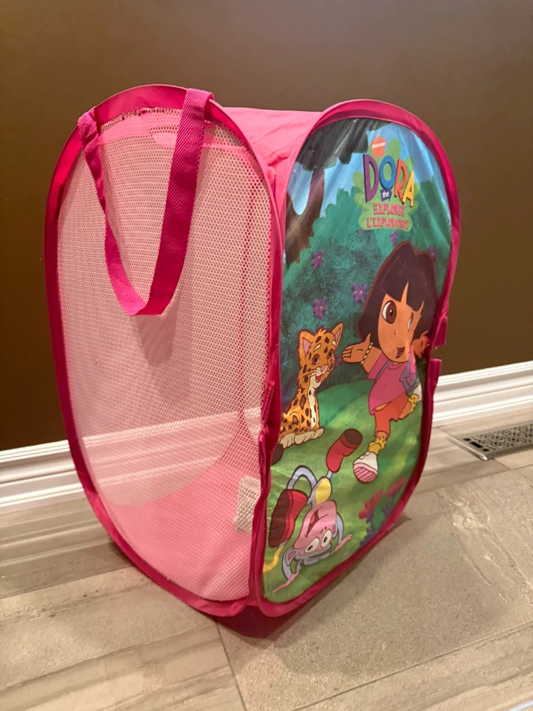This pink Dora the Explorer pop-up hamper is perfect for kids' rooms. It features mesh sides for ventilation and two handles for easy carrying. Great for storing toys or laundry!