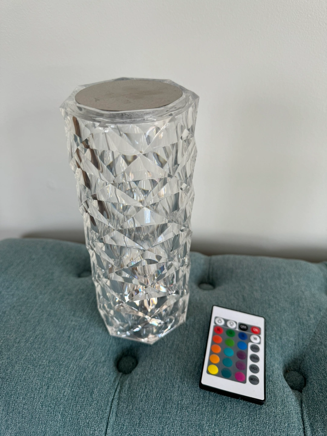 A crystal-like lamp that changes colours with a remote control. The remote control has a variety of colour options. USB chargeable.