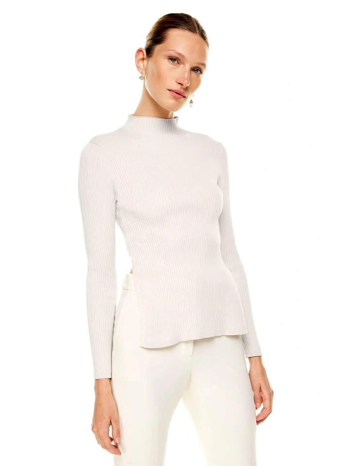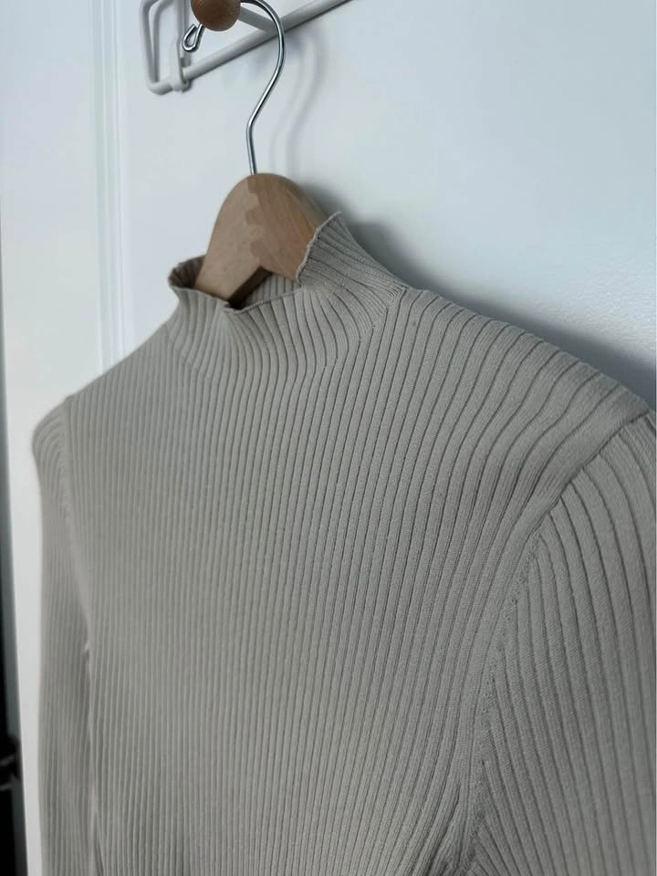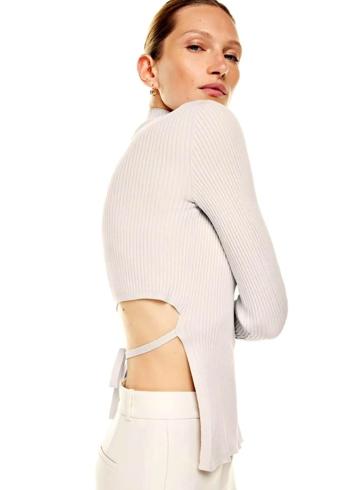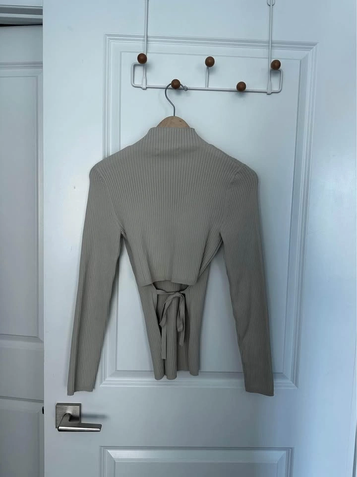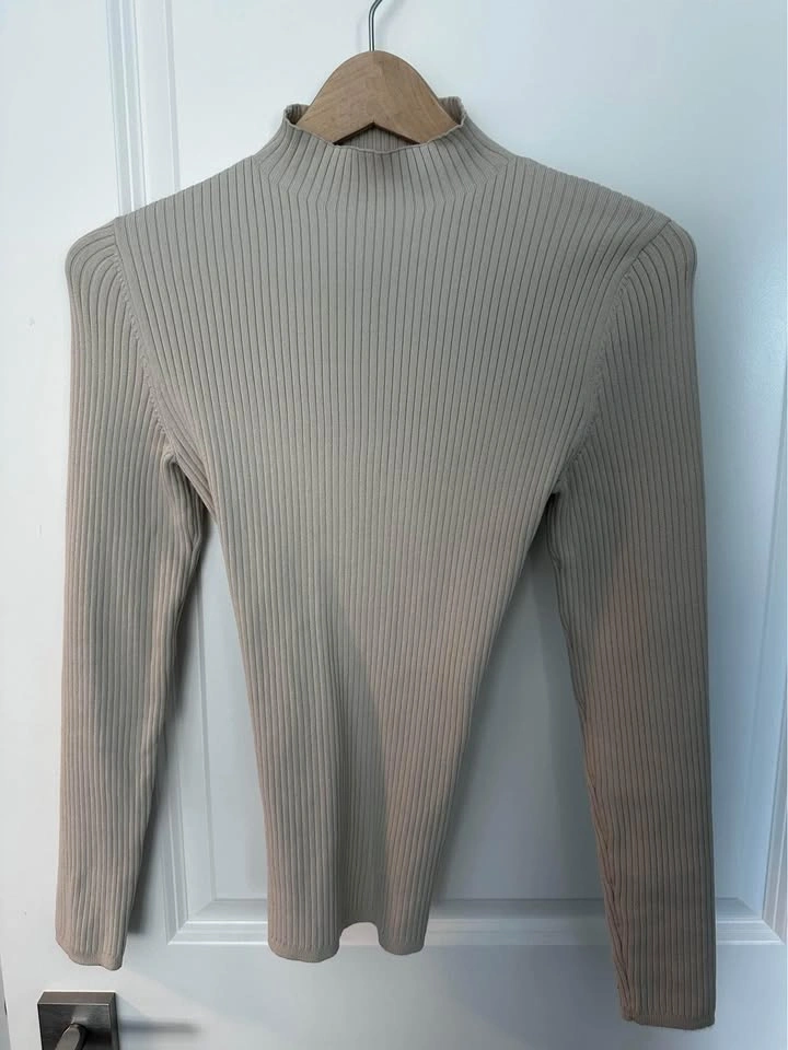 This is a fully fashioned mock-neck longsleeve with a cut-out detail at the back. It's constructed using a Wide Rib stitch with distinct columns for comfortable widthwise stretch. It's made with Sculpt Knit — Babaton’s signature figure-smoothing yarn. The perfect amount of stretch hugs in the right places to shape and sculpt your form. Features Back tie detail Fully fashioned construction means your knitwear fits you better with flat, smooth seams and less bulk. Plus, it reduces material waste in the production process. Materials & Care Content: 99% nylon, 1% elastane Size: Small Orig Price: $98 + tax Condition: like new - worn once.
