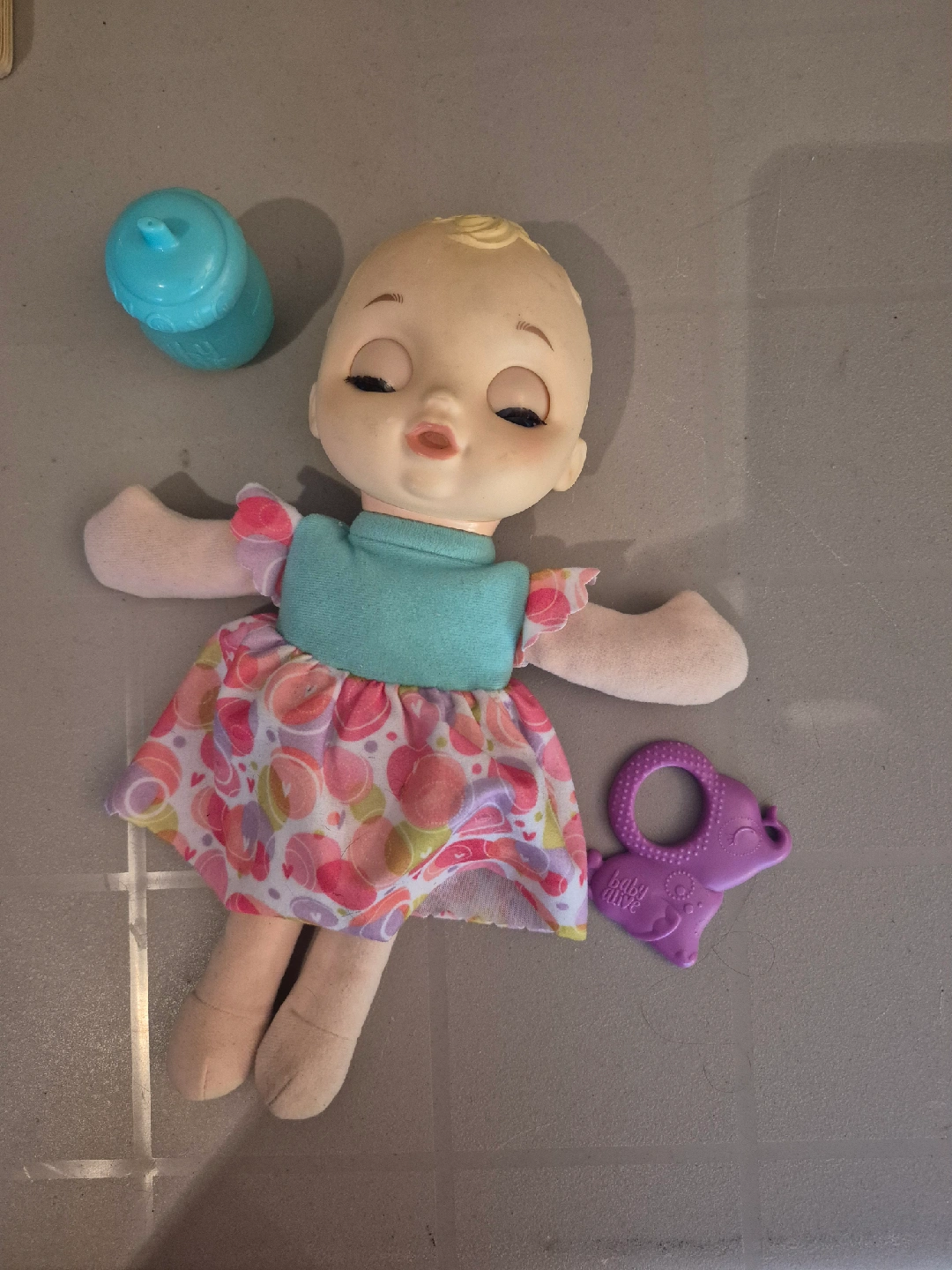 A cute Baby Alive doll is looking for a new home! It comes with a bottle and a purple elephant-shaped teether. The doll is wearing a colourful dress with a blue top. Perfect for little ones who love playing with dolls!