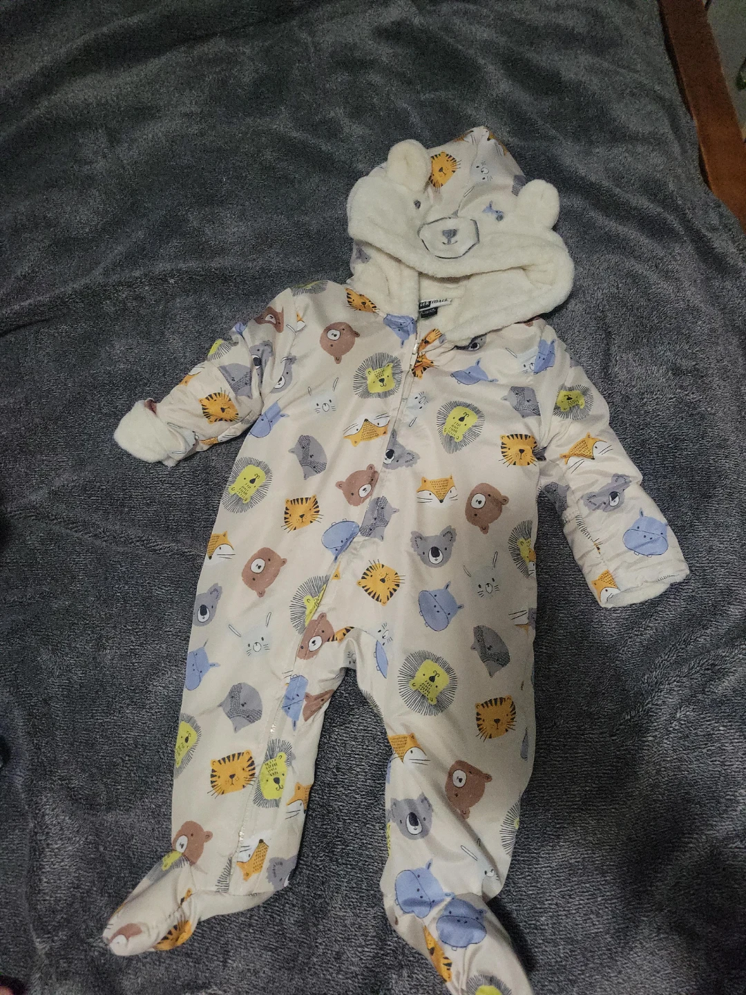 10Super cute baby snowsuit with an all-over animal print! It's perfect for keeping your little one warm and cozy during the colder months. The hood even has adorable bear ears!
