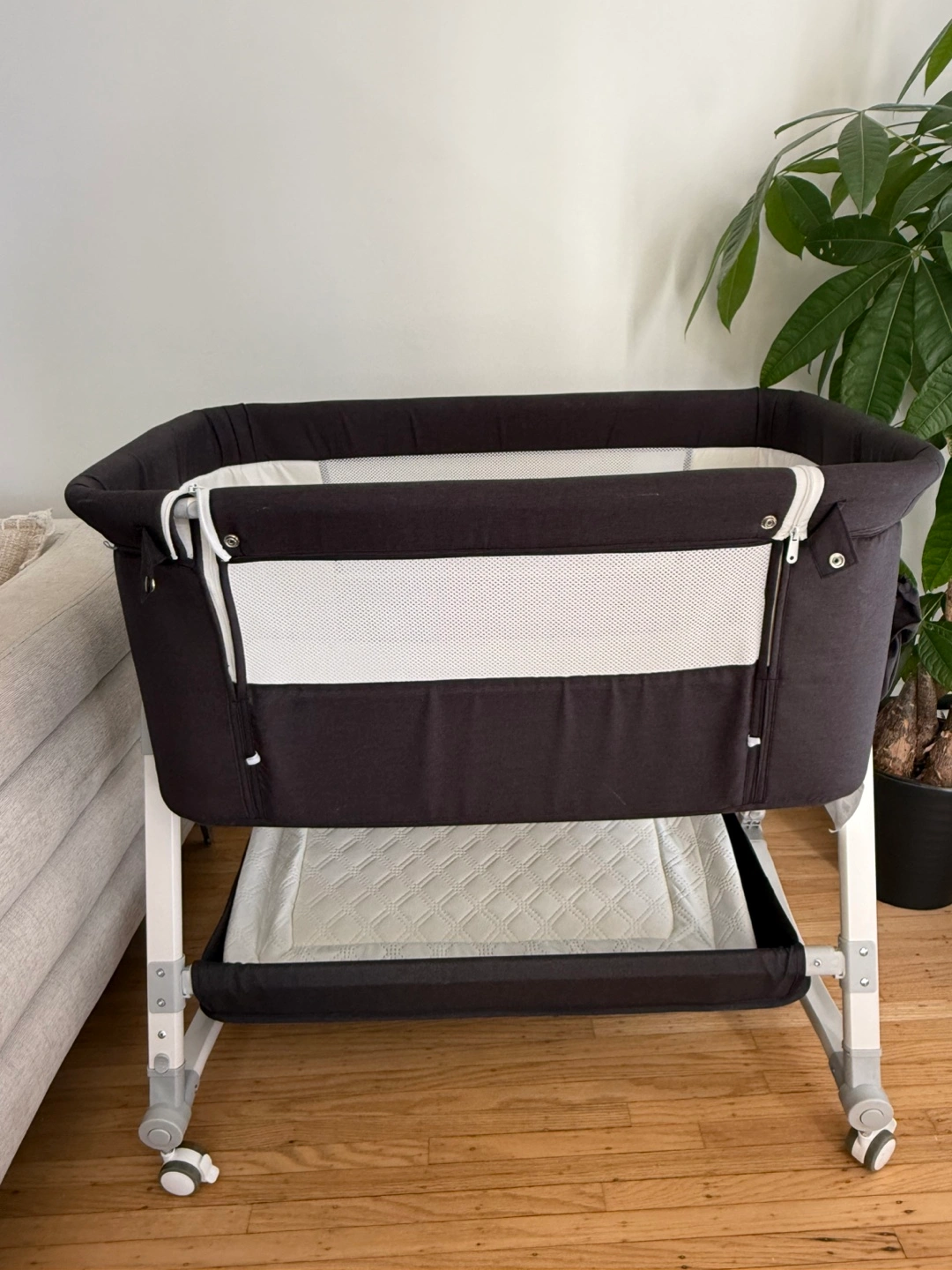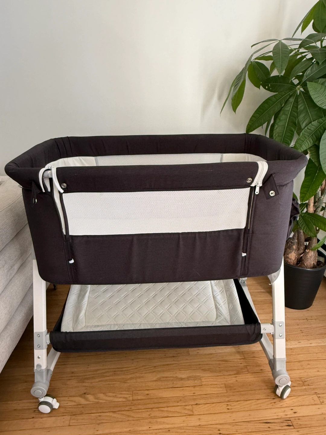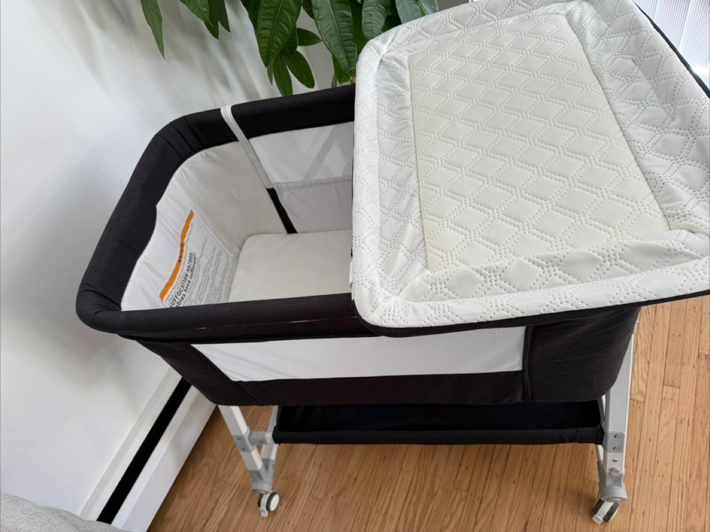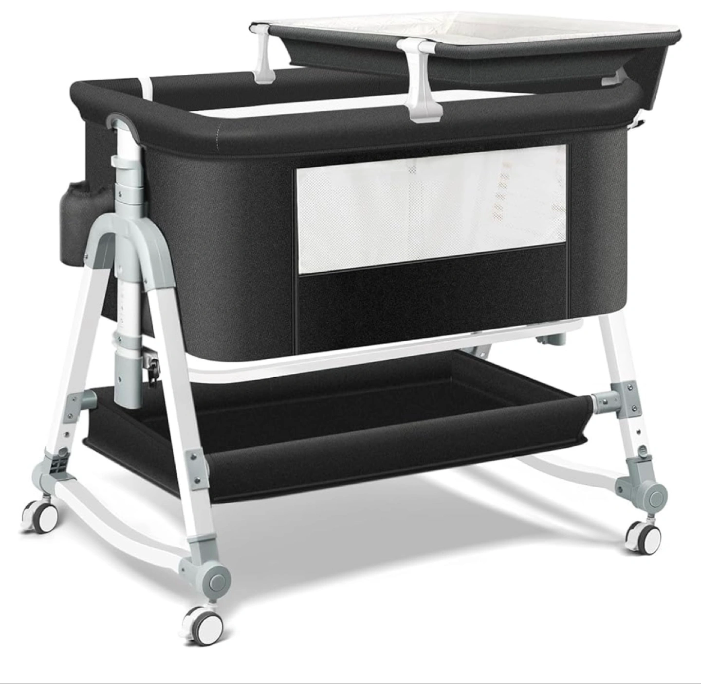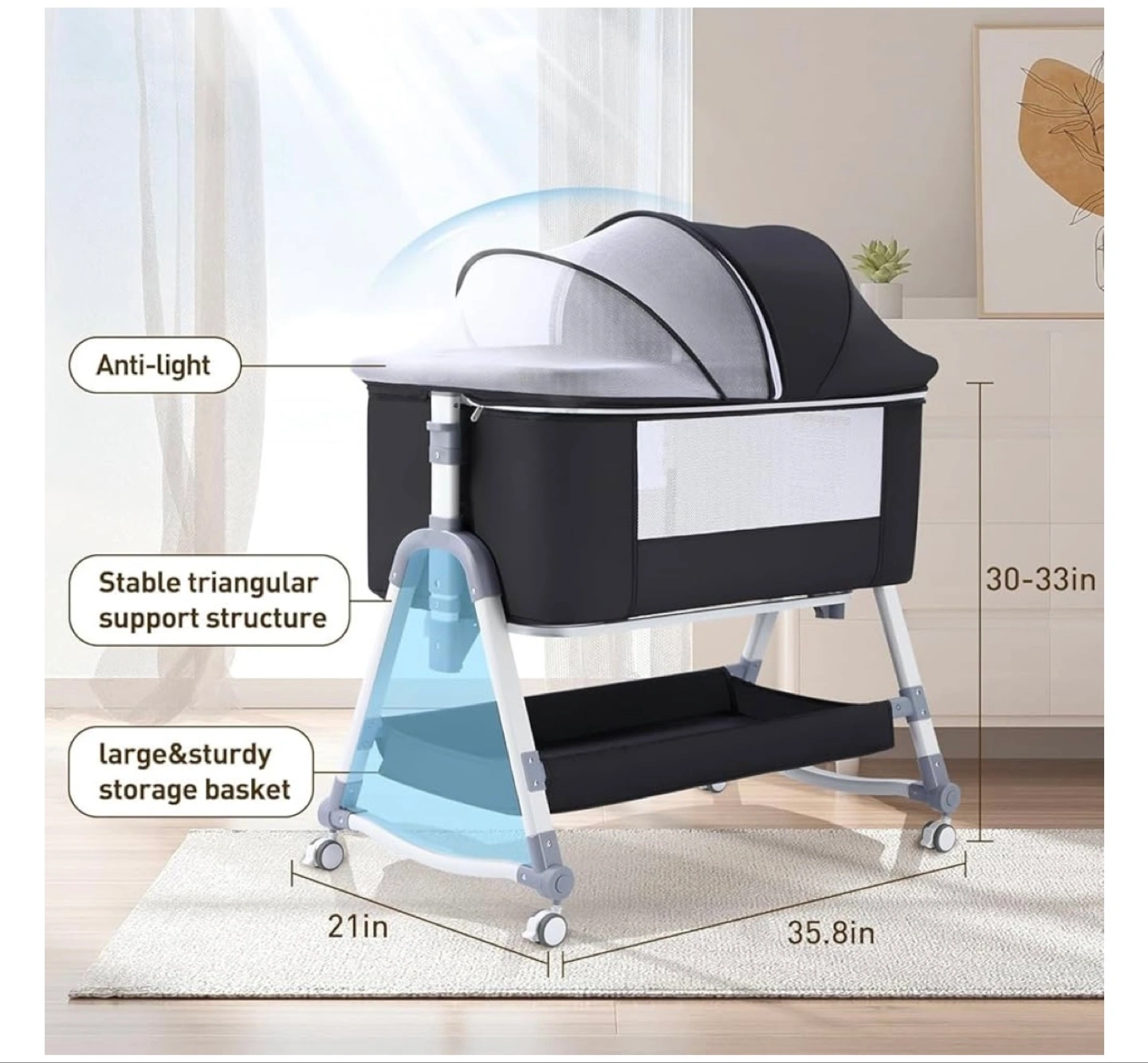 1044 and 1 Portable baby bassinet featuring a built-in changing table. Adjustable height to fit various bed heights. Includes a storage basket and anti-light canopy. Washable cover. Stable triangular support structure.
