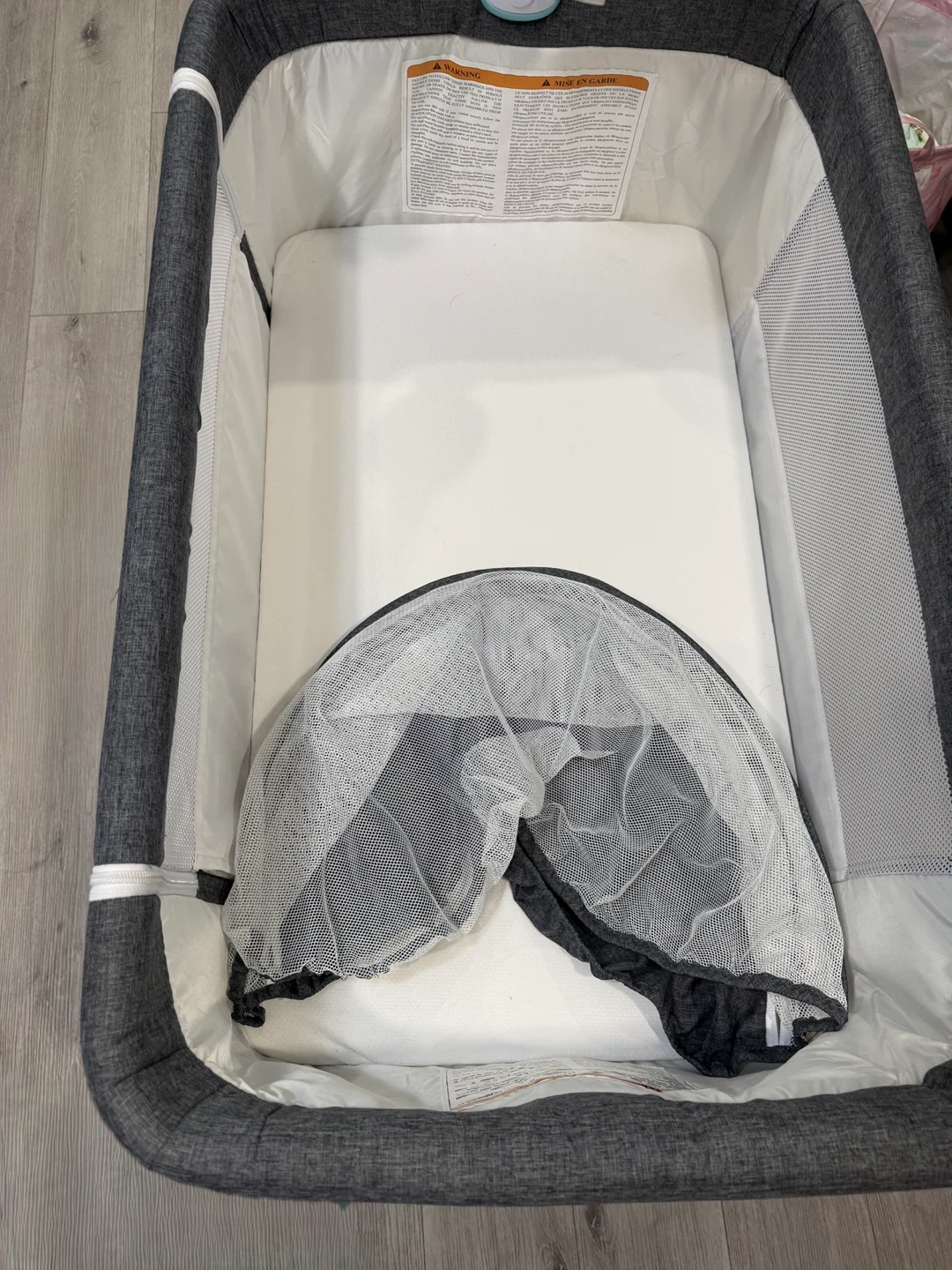 Selling a hardly used baby bassinet and the toy attached in great condition! It's grey and comes with a mosquito net. Perfect for your little one!. My baby slept in it for 2 or 3 times . It looks brand new