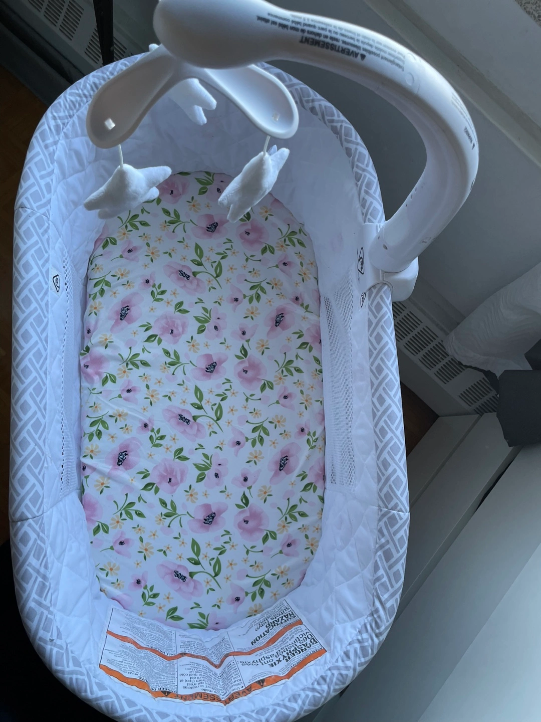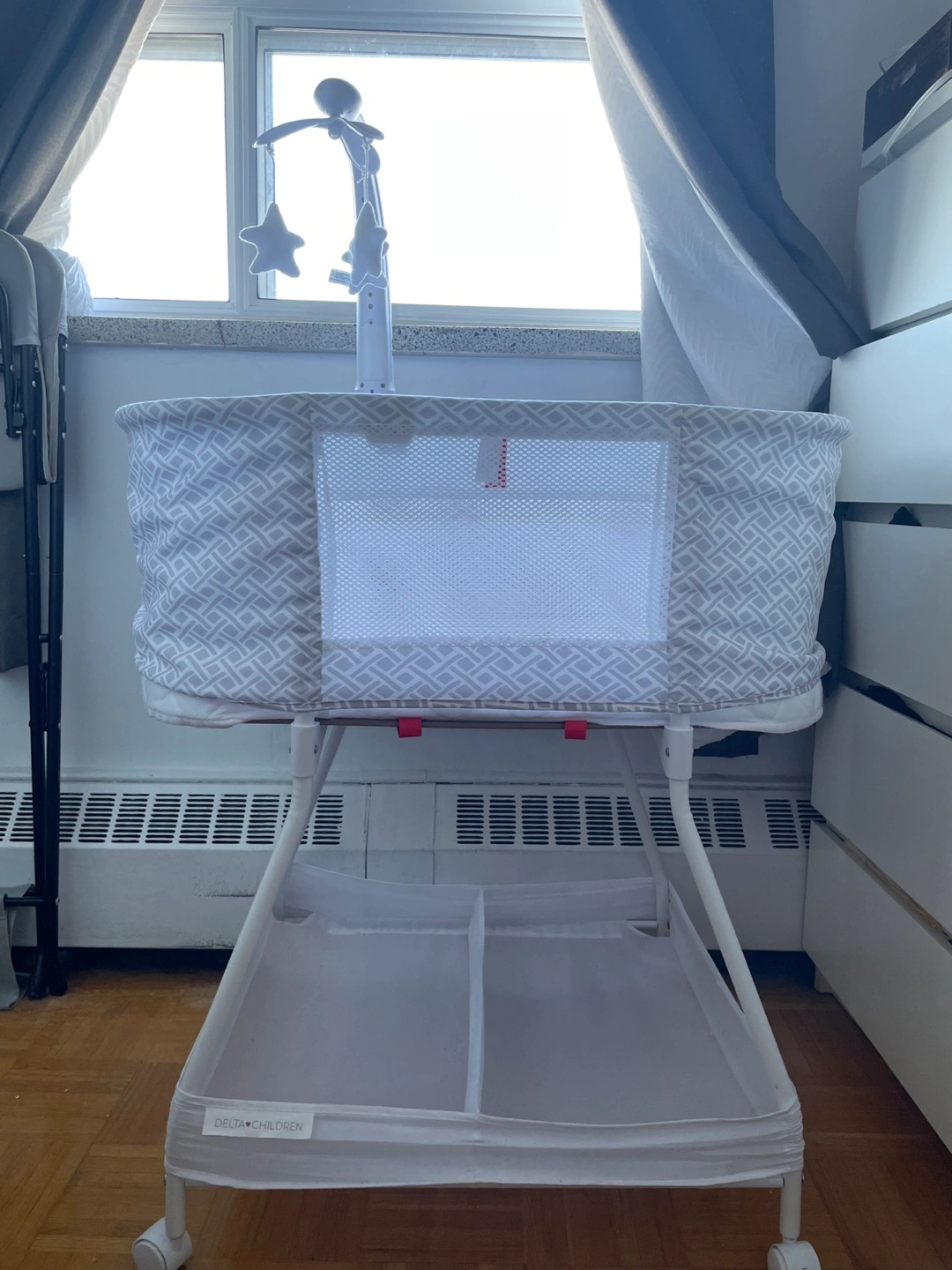 5Never Used Delta Children Baby Bassinet. Comes with starry mobile. Storage section down below for diapers, wipes and other baby toiletries. Has wheels for moving room to room and has breaks for wheels as well. Bassinet sheet is changeable. Already assembled.