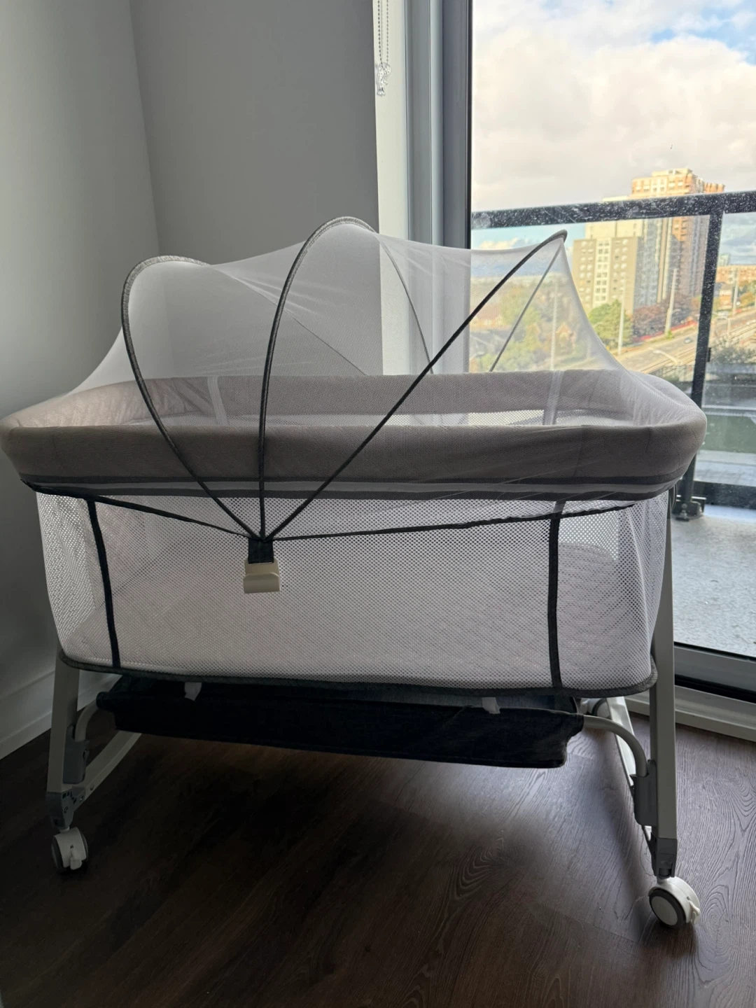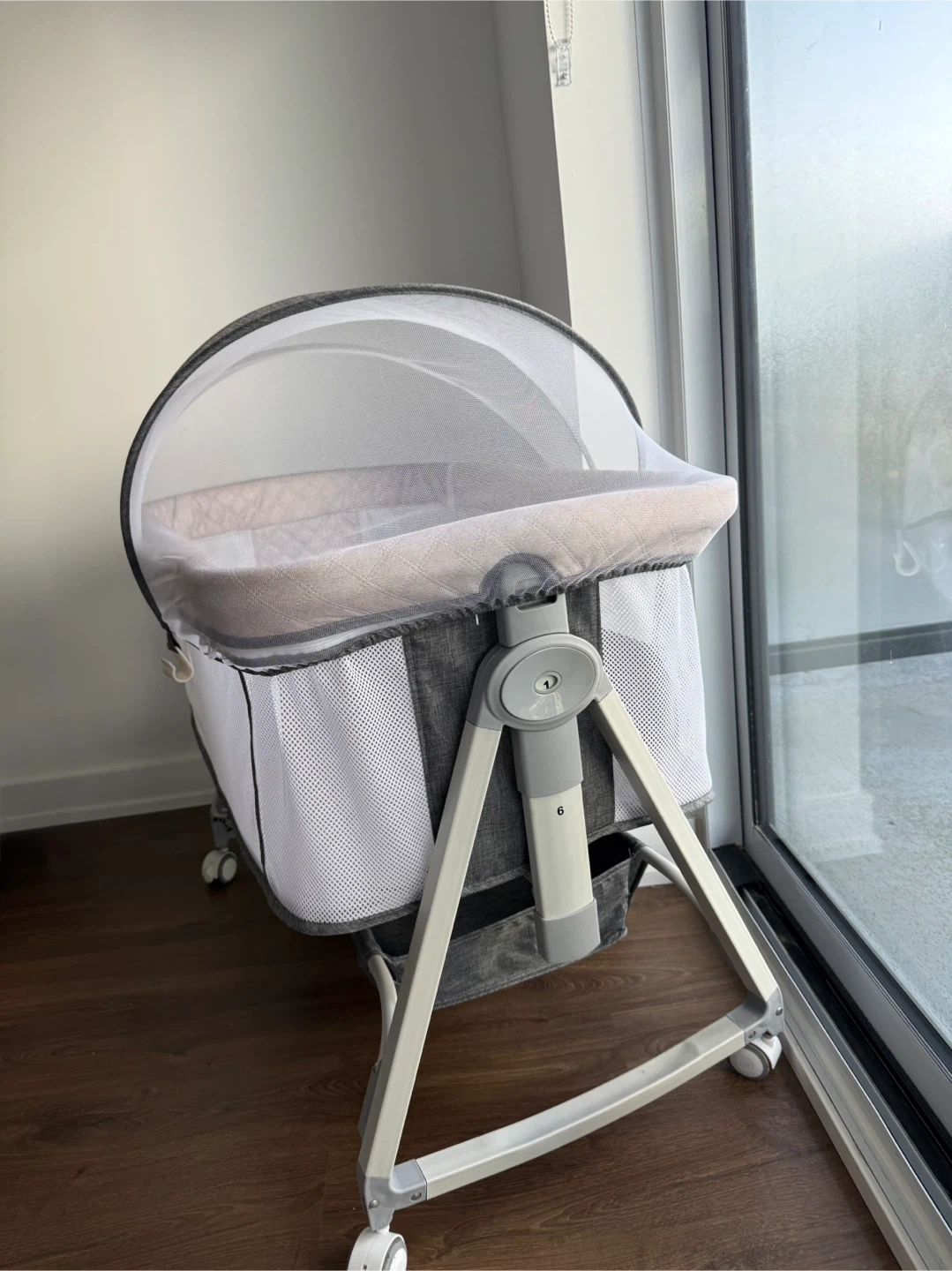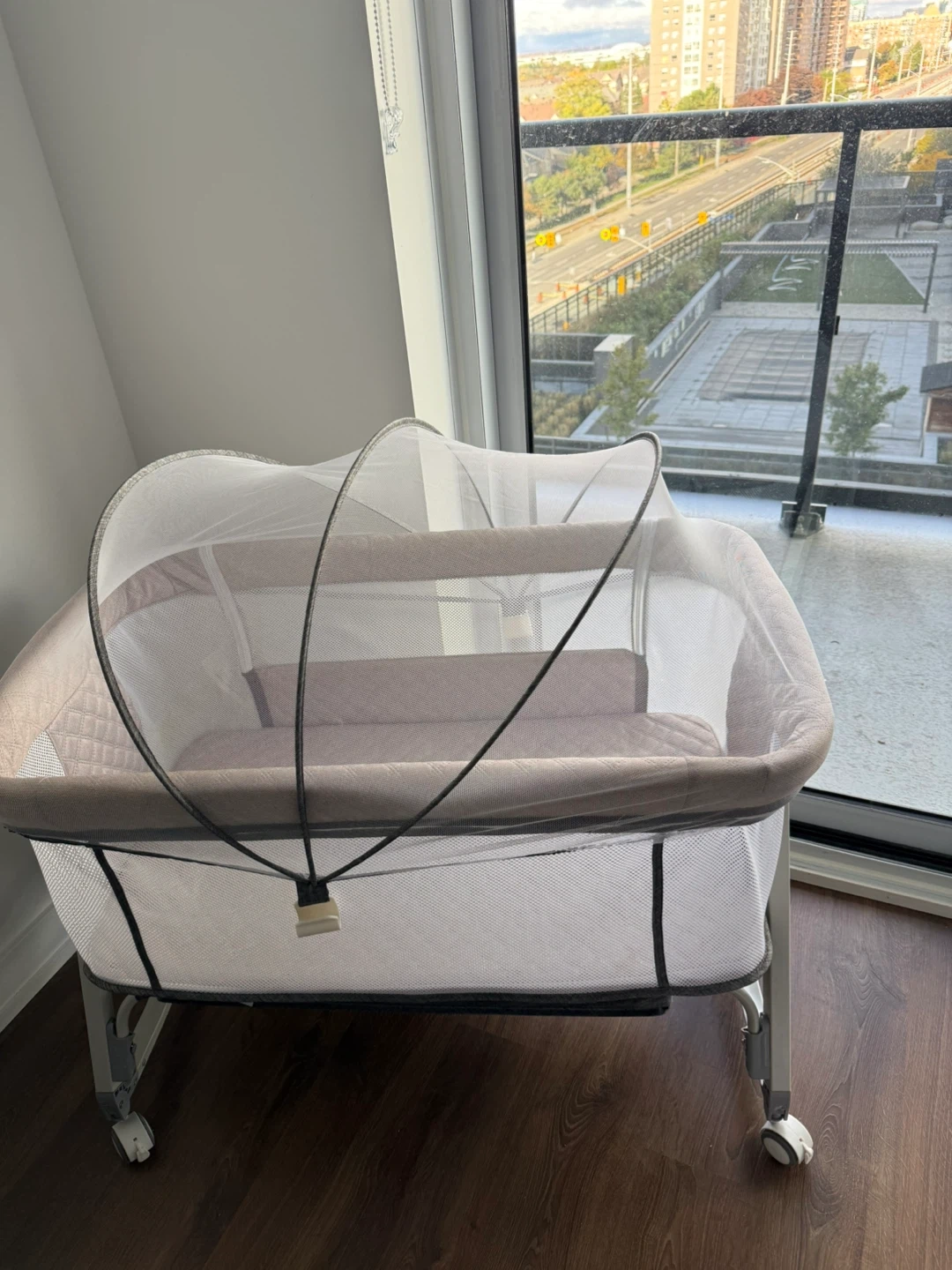 15Hi there! I’m relocating and selling my never-used baby bassinet and lounger, both in excellent condition from a smoke-free, pet-free home. The bassinet (bought for $168) has breathable mesh sides, a canopy, and smooth wheels, also includes a cute patterned cushion.. The baby lounger has a cute fruit print and is super cozy — selling both at a give away price. I’m also giving free new bed sheets for the bed.