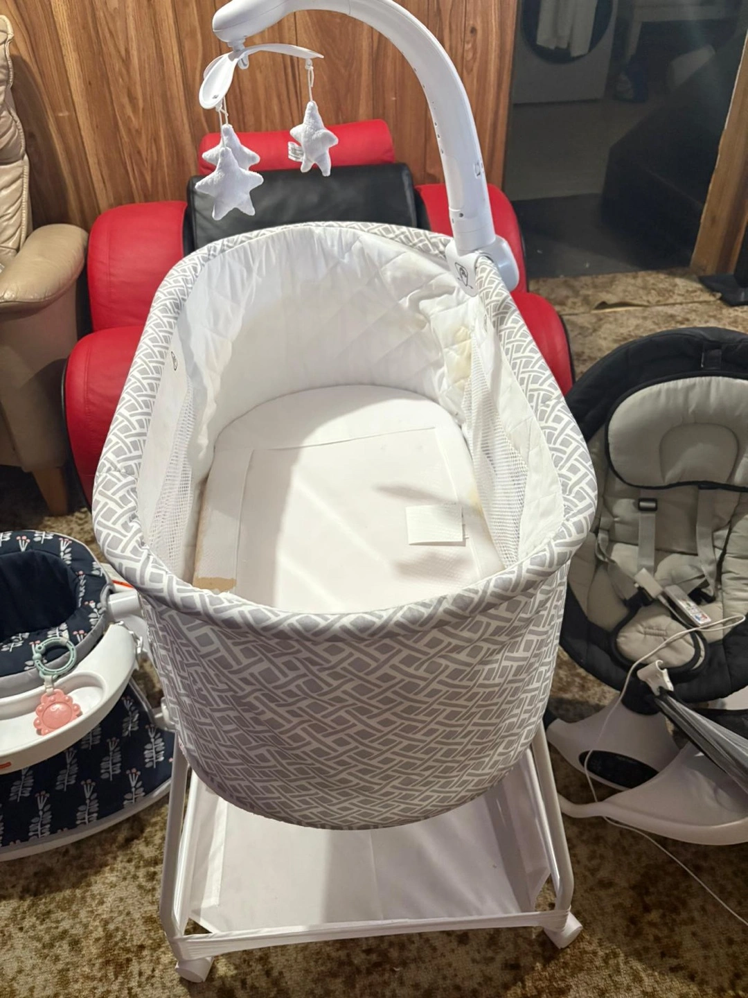 A bassinet with a patterned fabric and a stand. It has a mobile with star-shaped hanging toys. A great spot for your little one to get a good night's sleep.
