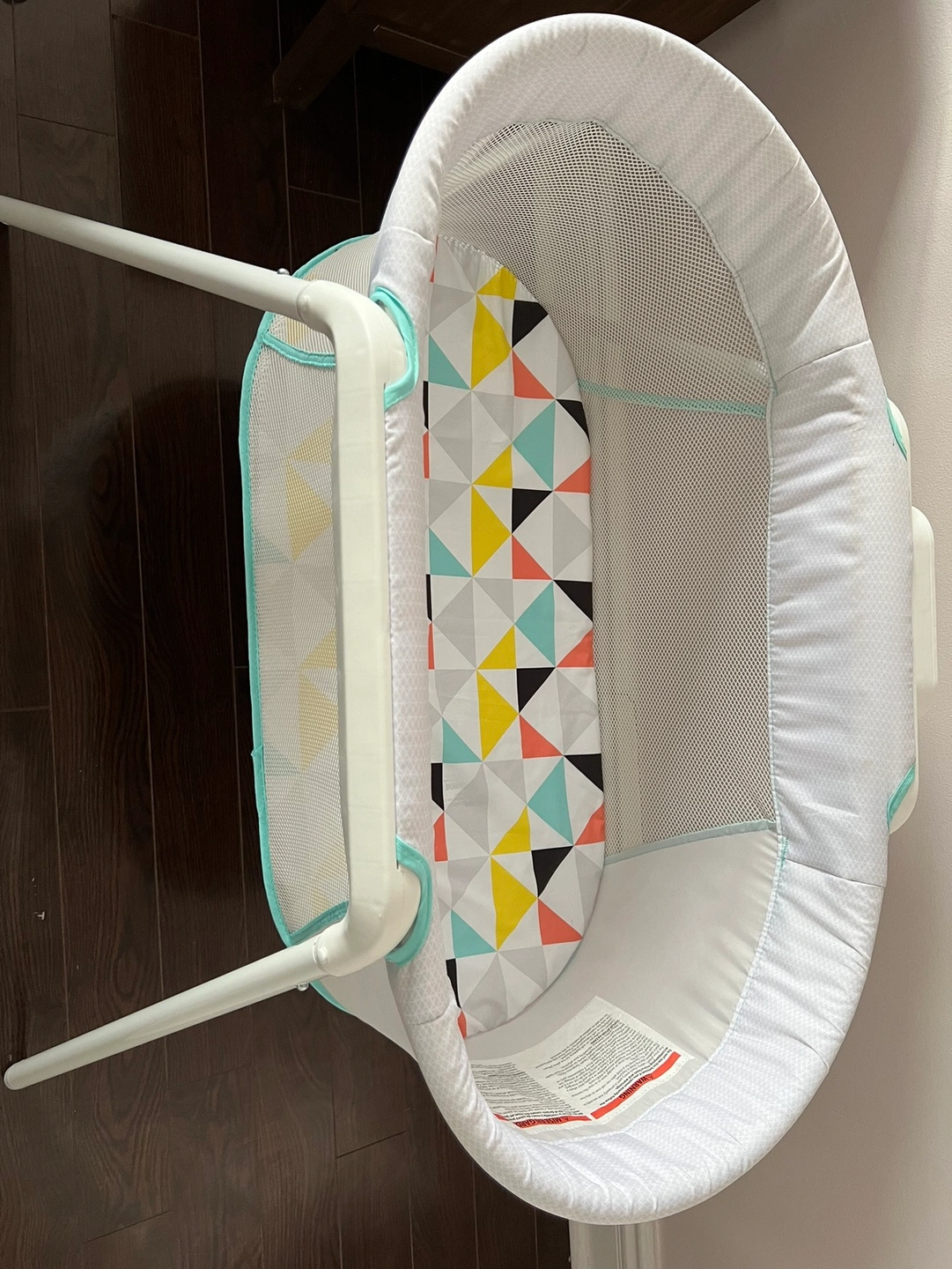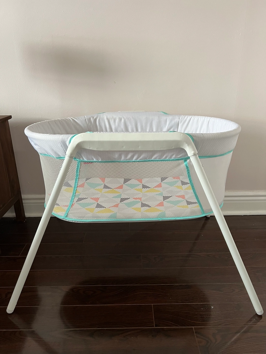 15This bassinet has a mesh side and a geometric print. It comes with a stand.