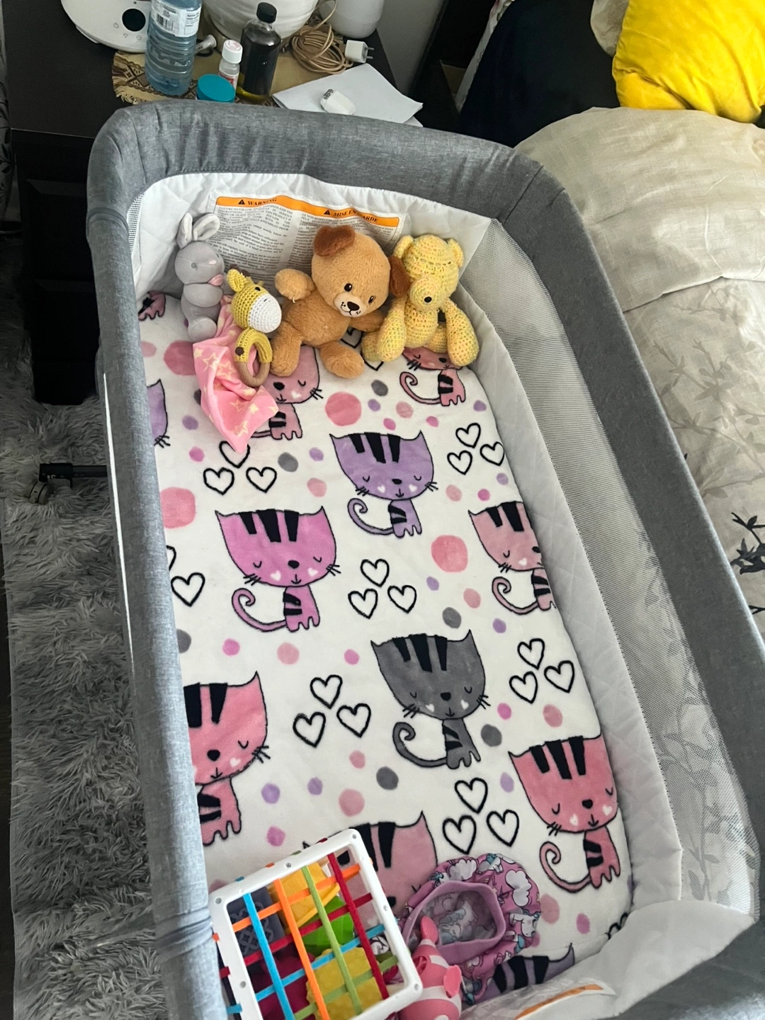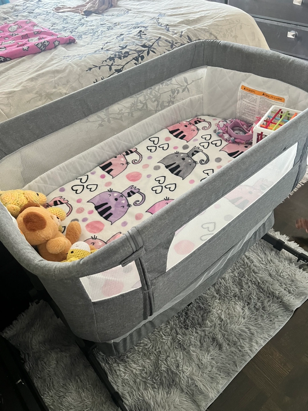 65Grey fabric bassinet. Includes stand. Suitable for newborns. Gently used. 5 Small sheets included.