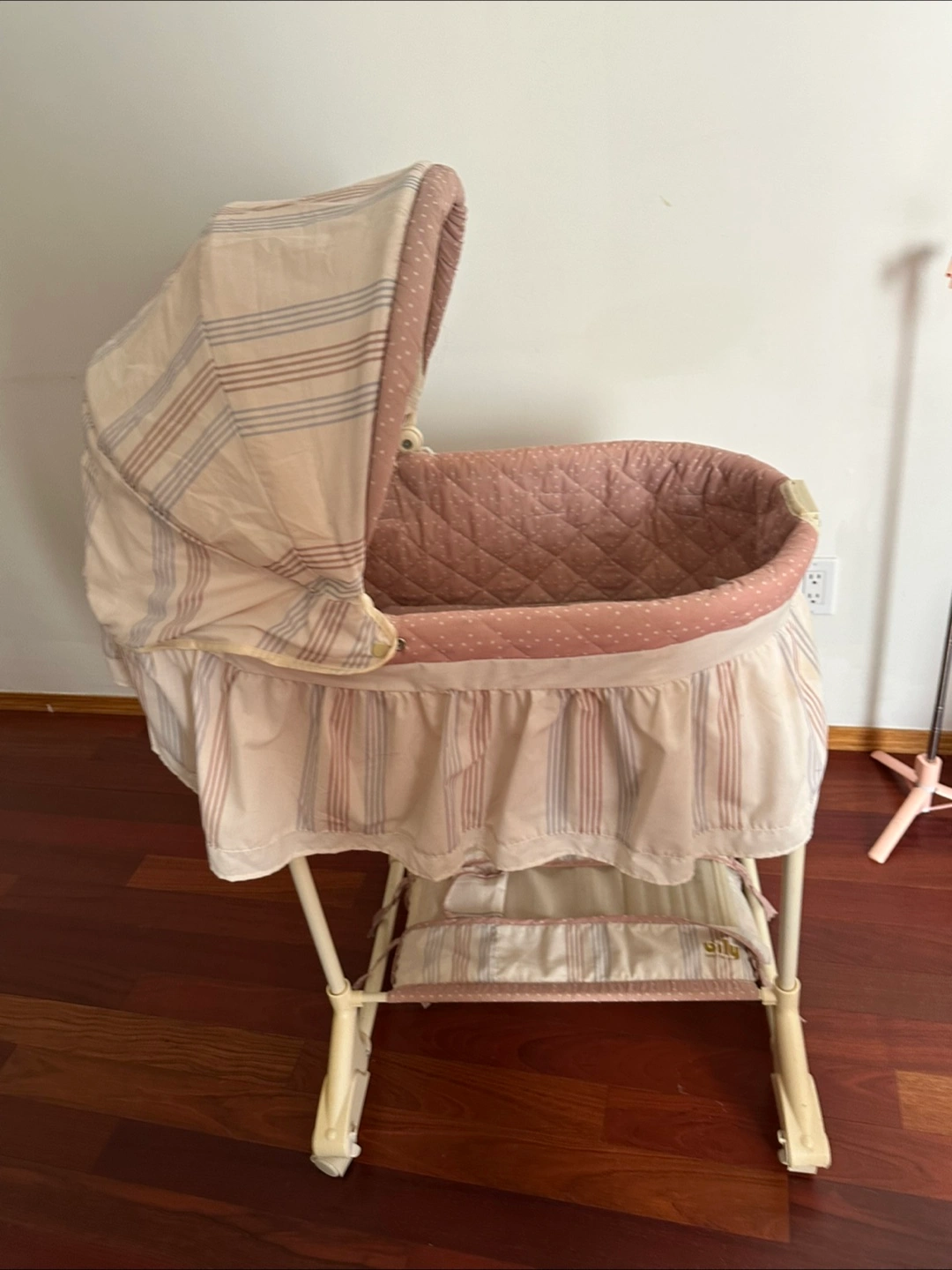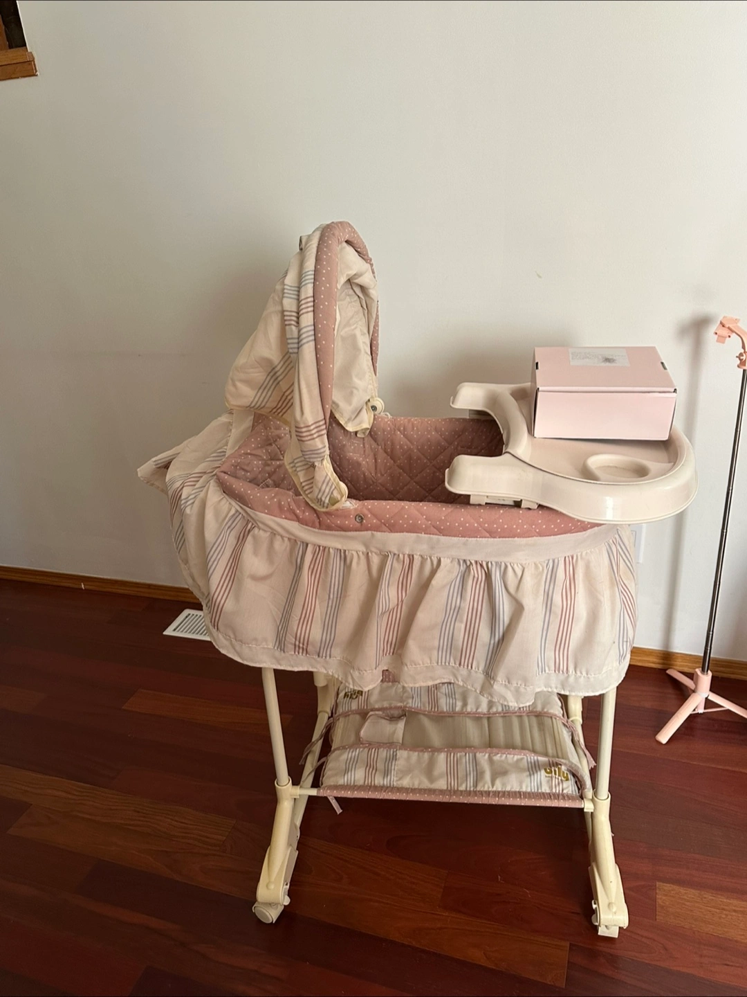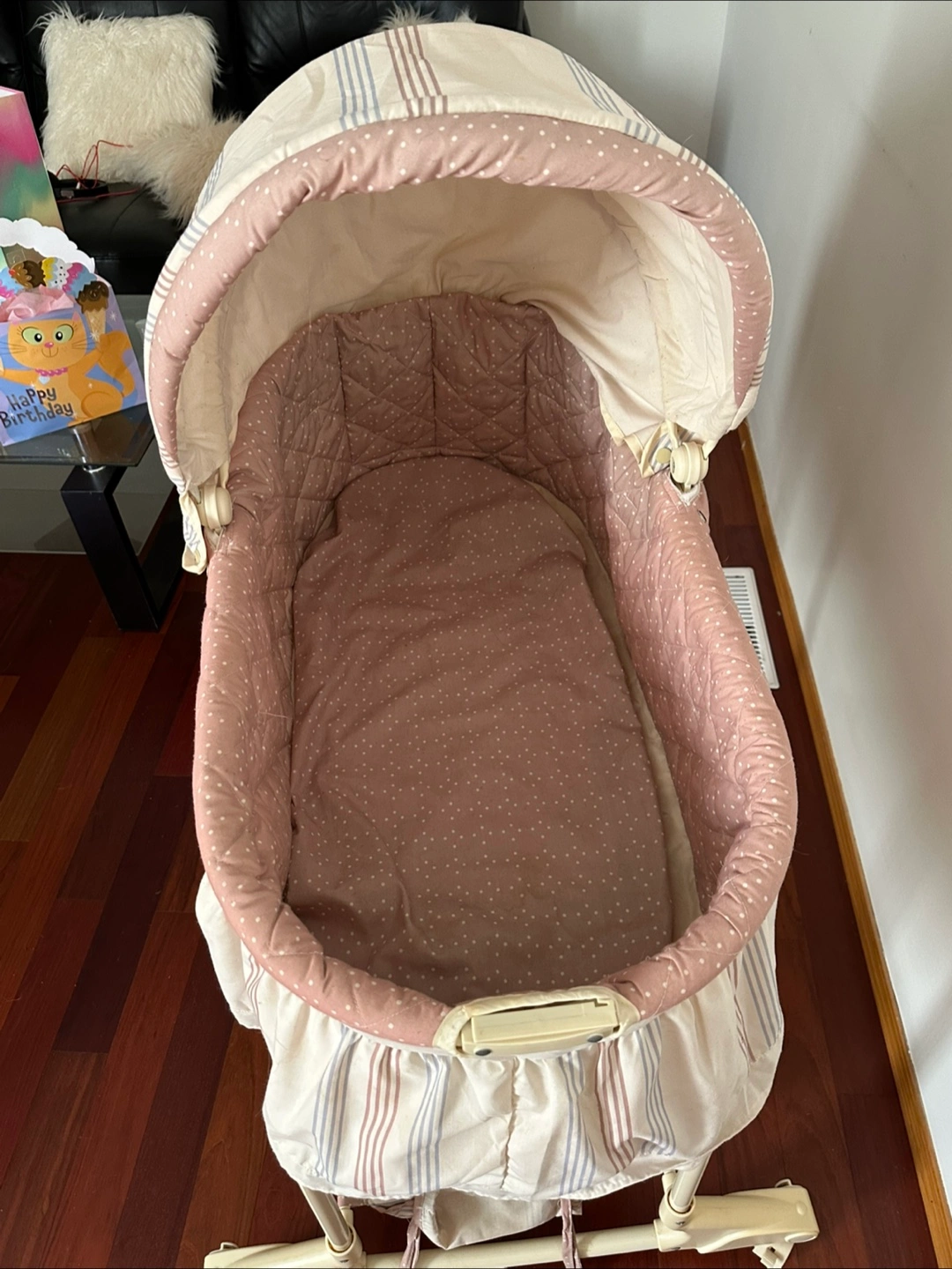 Used baby bassinet. Includes stand, wheels and storage shelf, and canopy. Pink and beige colour scheme. Wheels for easy mobility.