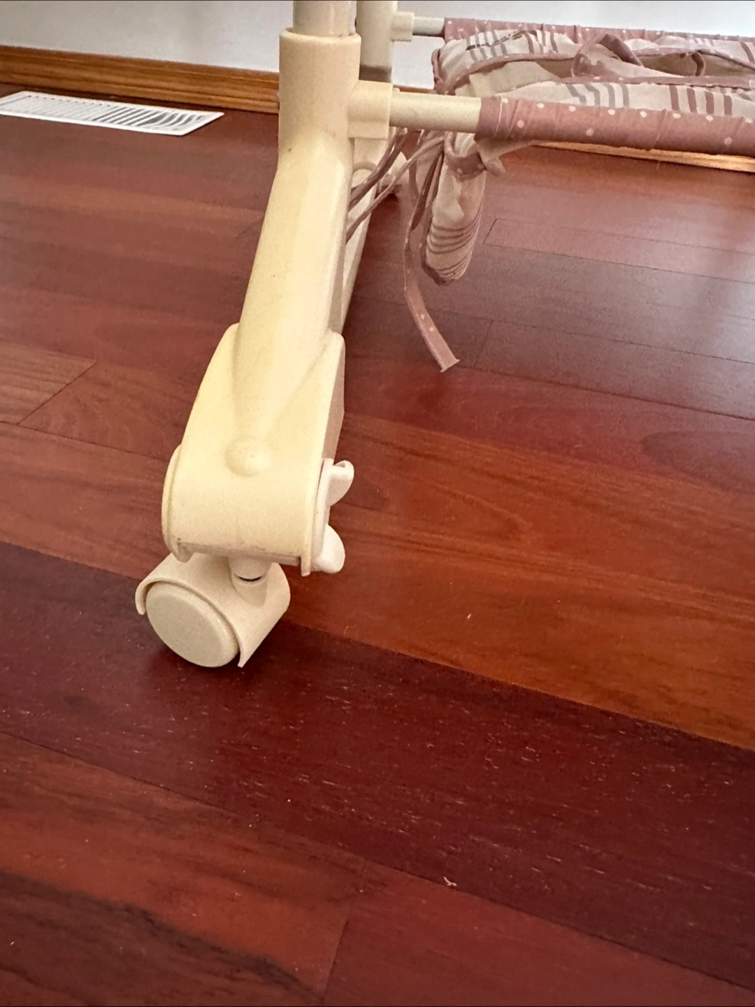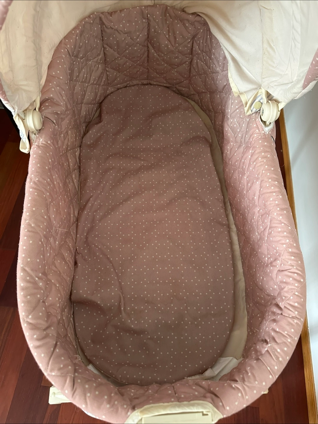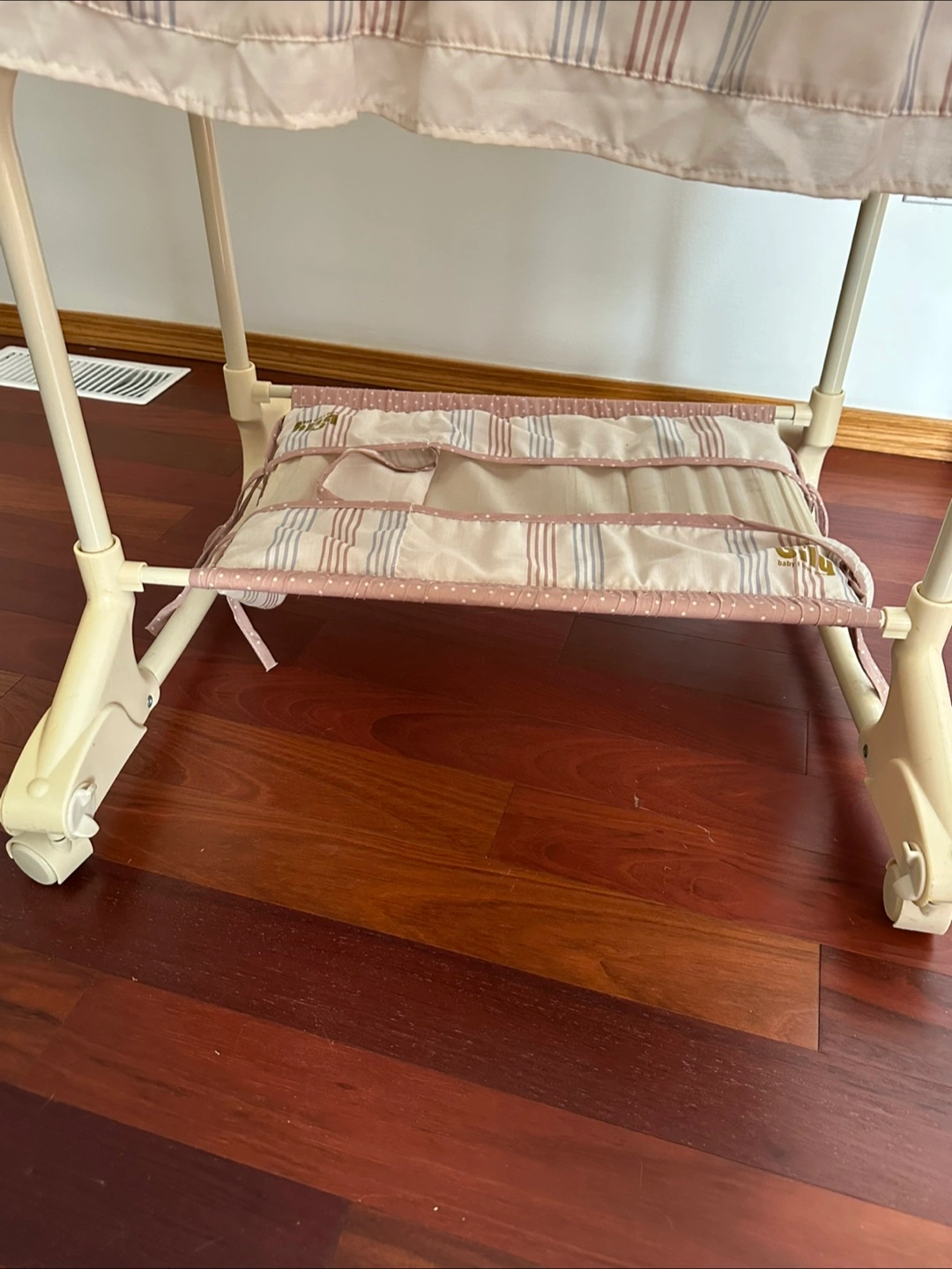 Used baby bassinet. Includes stand, wheels and storage shelf, and canopy. Pink and beige colour scheme. Wheels for easy mobility.