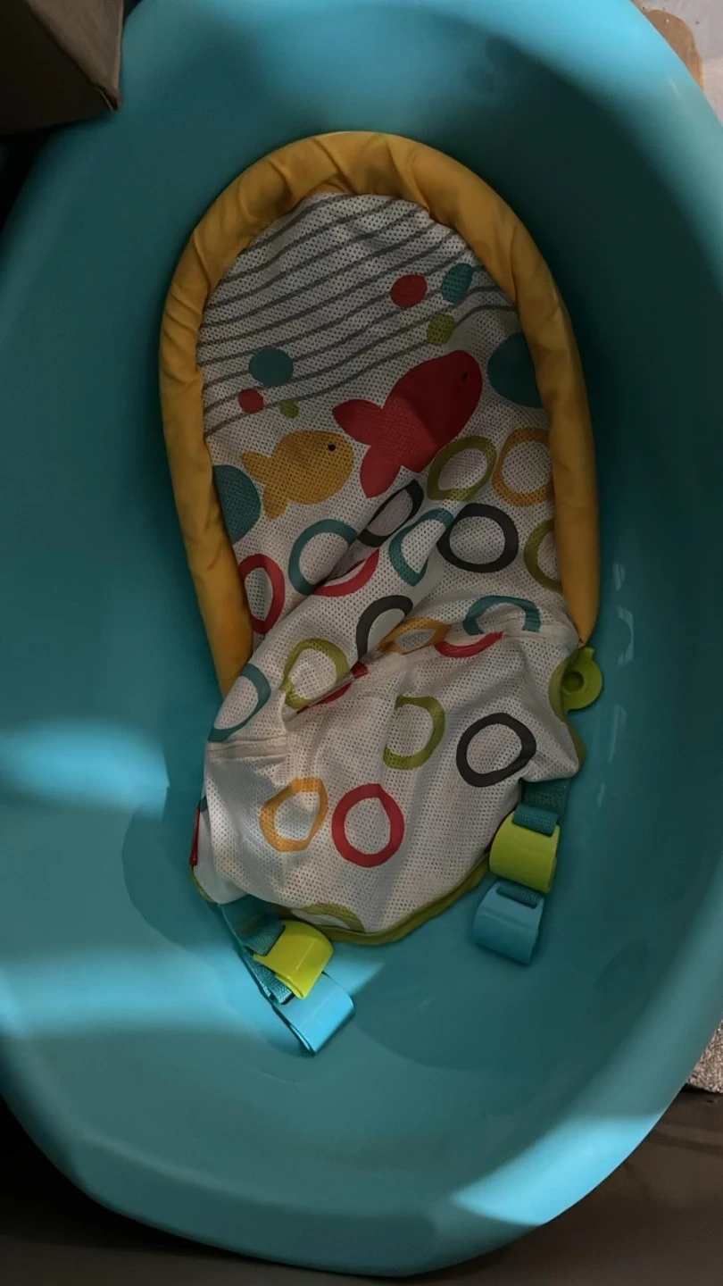 60Selling a baby bathtub with a sling insert. The tub is a light blue colour and the sling has a fun fish and circle pattern. Perfect for newborns and infants!
