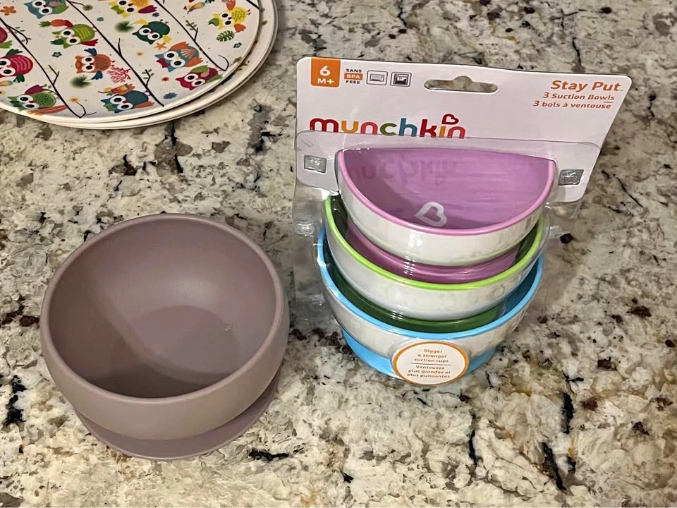 Never used silicone bibs x3. Never used silicone suction bowl. These were brought from the country we moved from, ended up not being necessary. Never opened Munchkin suction bowls x3. The plates are not kid specific but can be included since they need to go.
