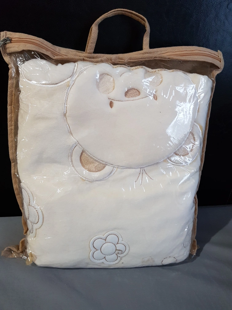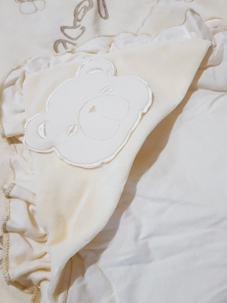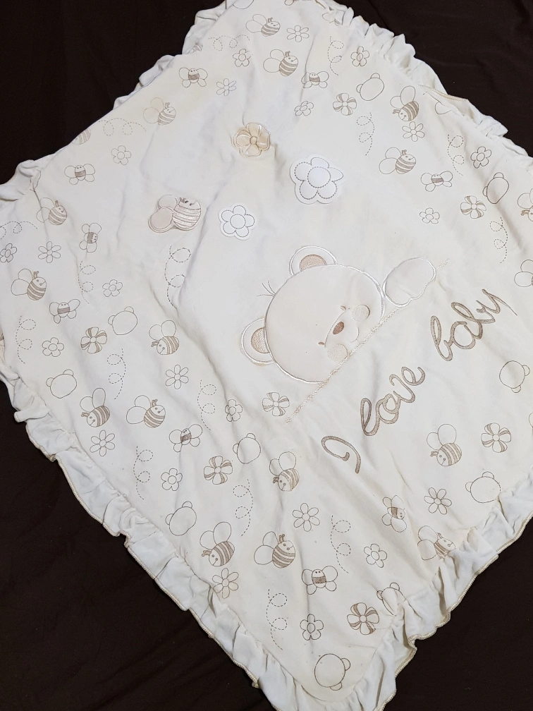 Cream-coloured baby blanket. Features embroidered bears, bees, and flowers. Soft material. Comes in a protective bag with a handle. Perfect for a baby shower gift.