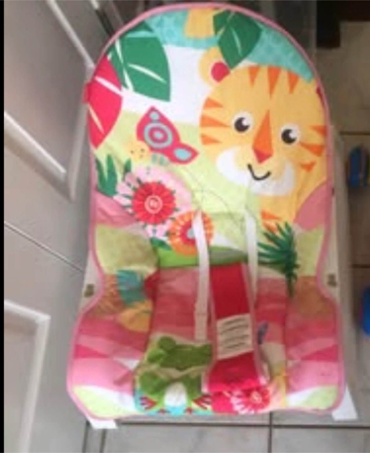 31Free a cute baby bouncer seat with a fun tiger and floral design! Perfect for keeping your little one entertained and comfy. The seat features a safety harness and vibrant colours to stimulate your baby's senses