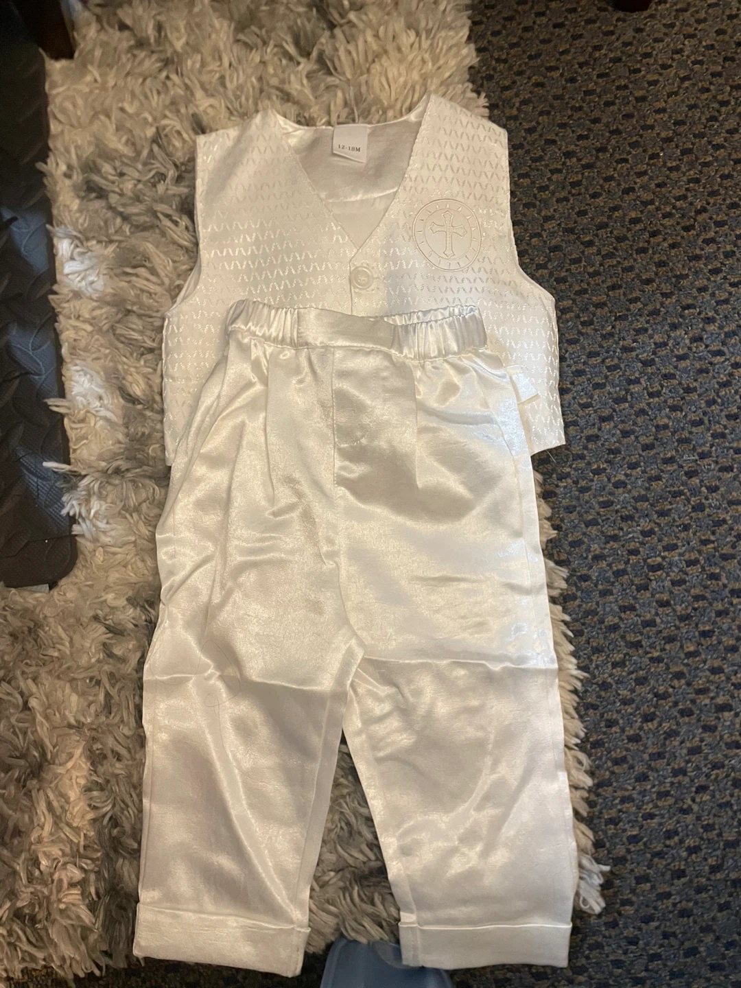 68Selling a gently used white baptismal outfit. The set includes a vest, pants, shirt, hat, tie, and shoes. The vest is sized 12-18M. Perfect for a special occasion! All are 12-18m, used it for 1 hour only. It is in excellent condition!