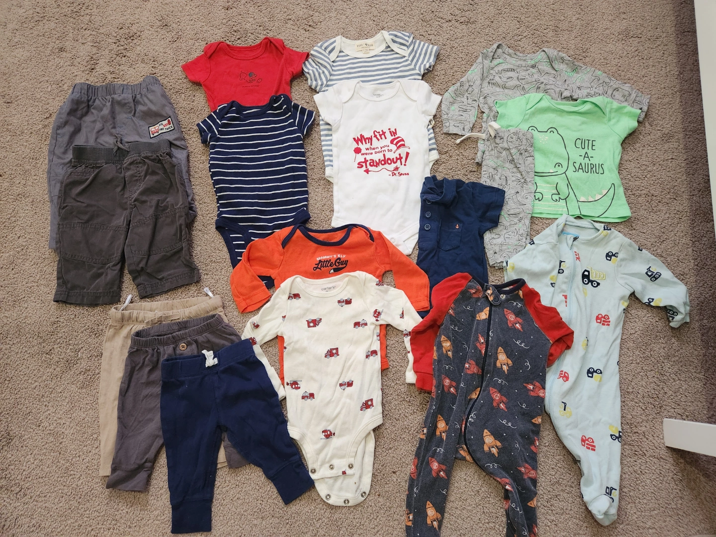 15Bundle of baby boy clothes, including bodysuits, pants, and sleepers. Various colours and patterns. Carter's brand included.