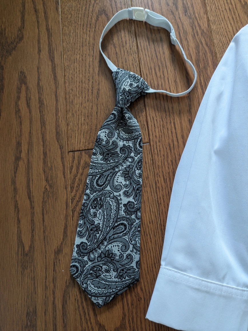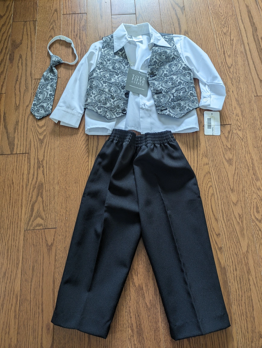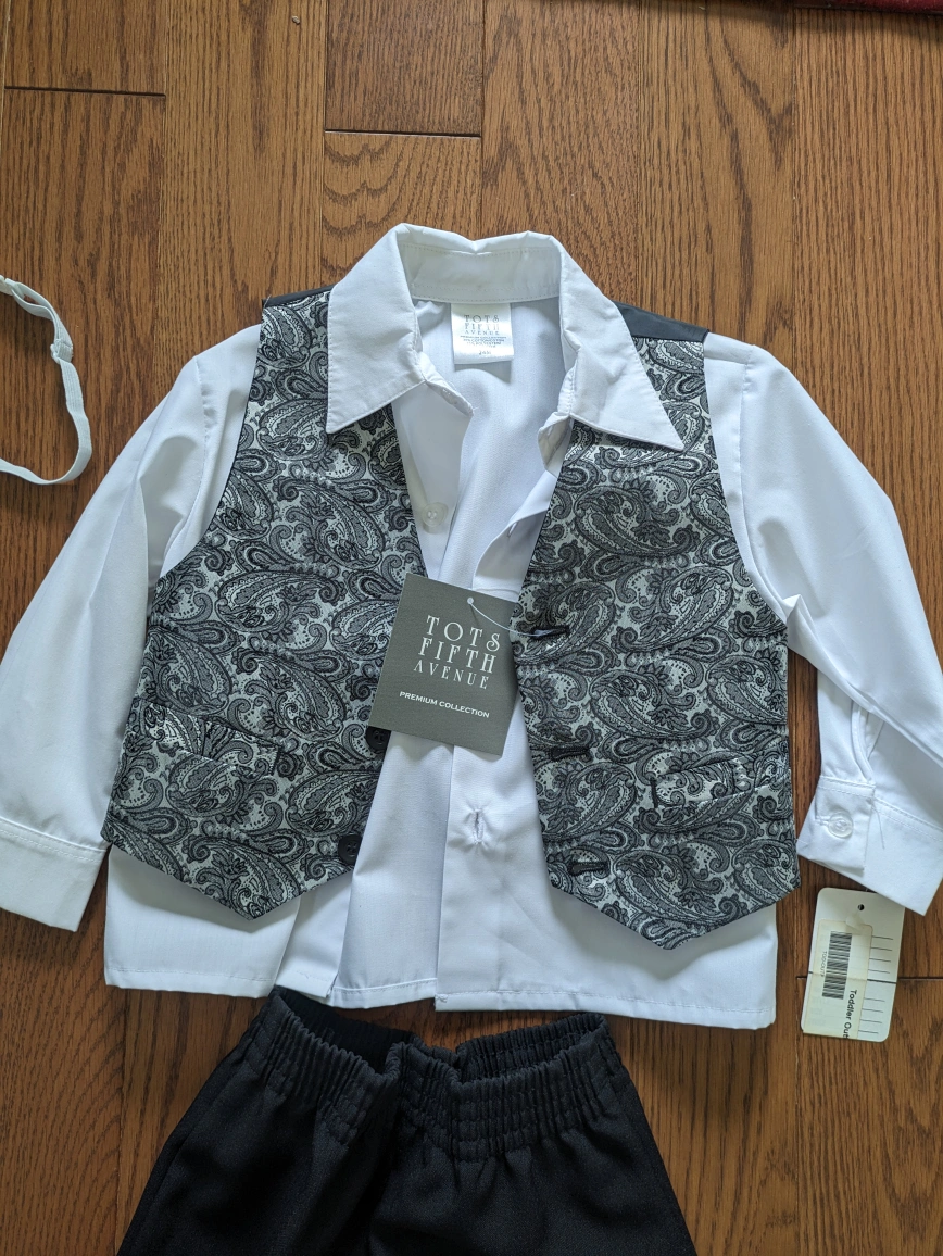 12Adorable baby boy's 4-piece outfit. Includes a vest, dress shirt, pants, and tie. Perfect for special occasions. Grey and black paisley pattern on vest and tie. Black pants. New with tags.
