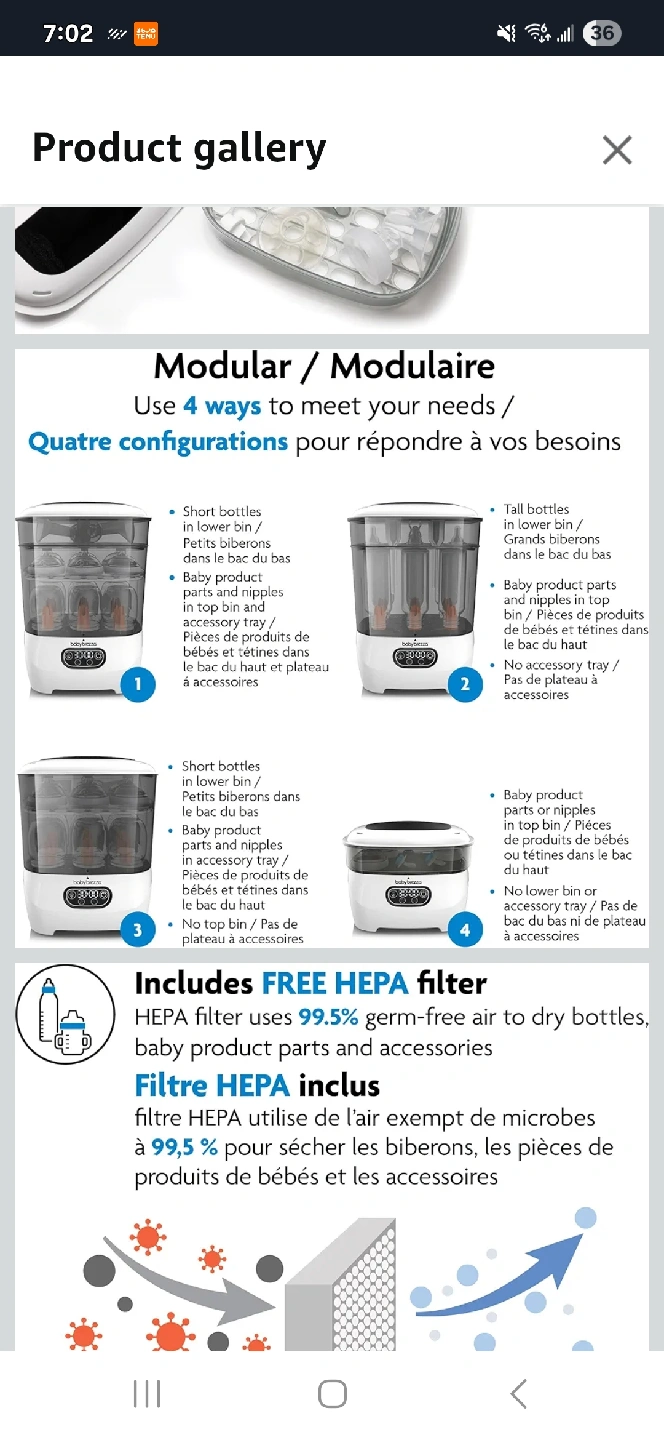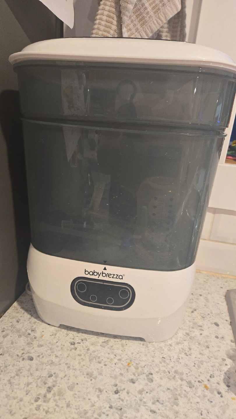 Keep your baby bottles clean and dry with this Baby Brezza sterilizer and dryer! It uses a HEPA filter to ensure 99.5% germ-free air for drying your baby bottles, parts, and accessories. It's modular and can be configured in four different ways to meet your needs.