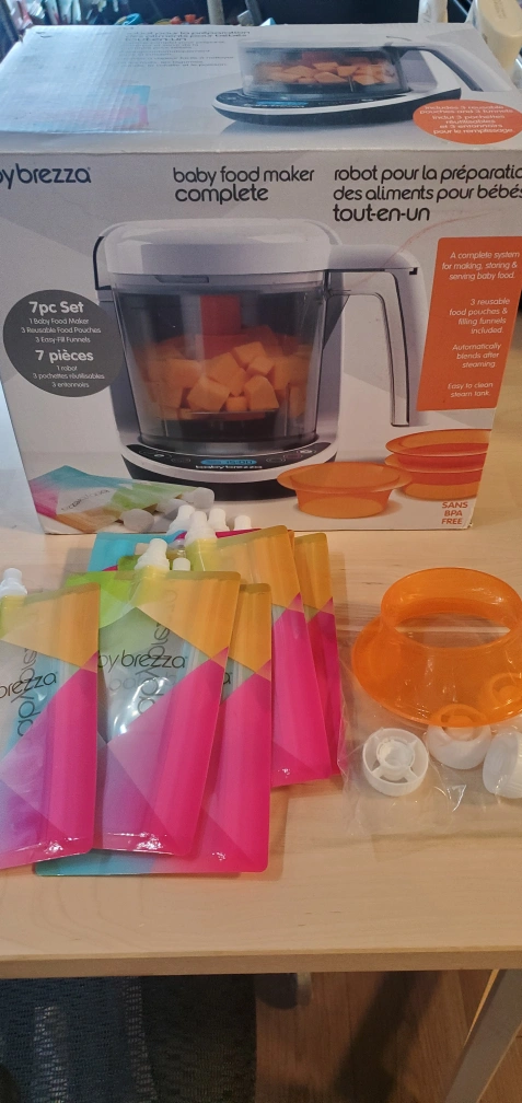 Selling a Baby Brezza Baby Food Maker Complete includes 7 new reusable food pouches and comes with the box! its save time to make babyfood!