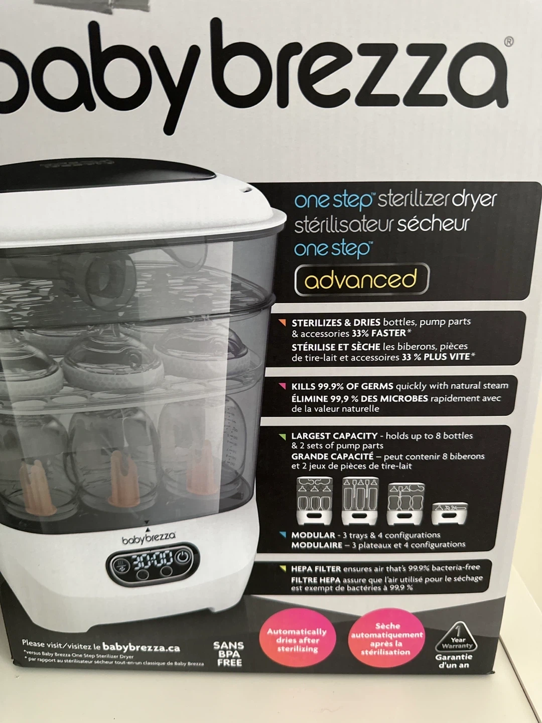 Selling a Baby Brezza One Step Sterilizer Dryer! It sterilizes and dries bottles, pump parts, and accessories 33% faster. It kills 99.9% of germs quickly with natural steam. It has the largest capacity, holding up to 8 bottles and 2 sets of pump parts. It's modular with 3 trays and 4 configurations, and the HEPA filter ensures the air is 99.9% bacteria-free