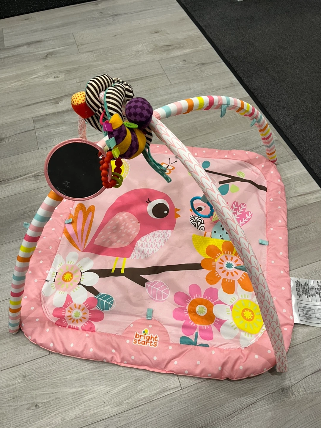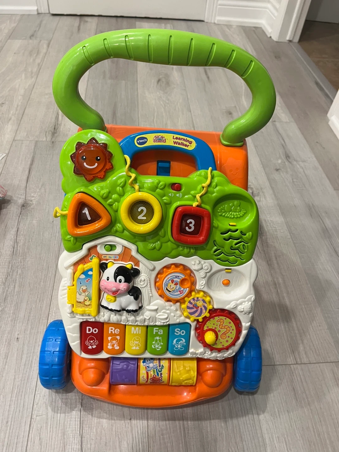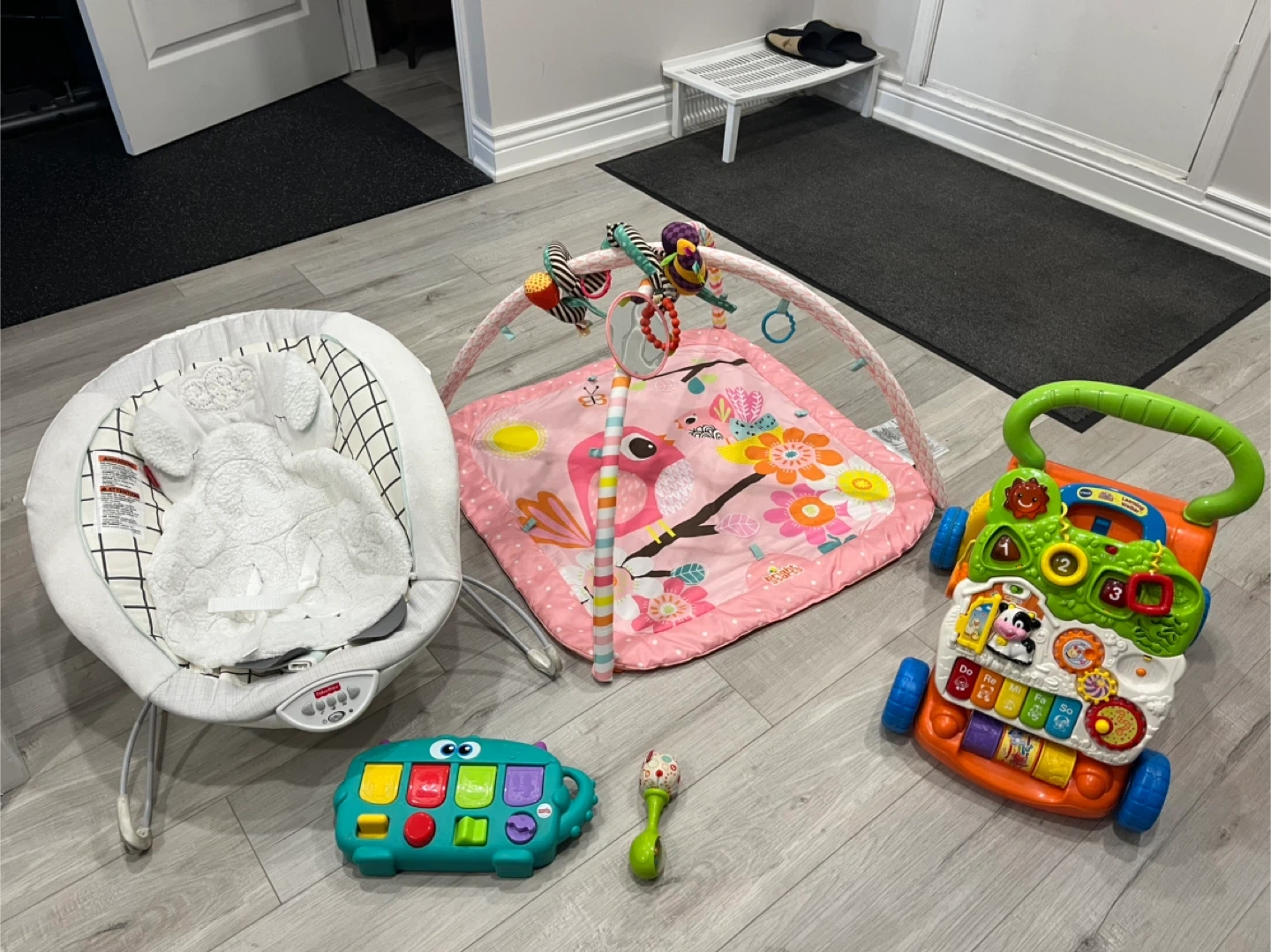 Selling a bundle of baby items in great condition! Includes a bouncer, a Bright Starts play mat, a VTech walker, a Fisher-Price toy, and a rattle. Perfect for keeping your little one entertained and developing their motor skills
