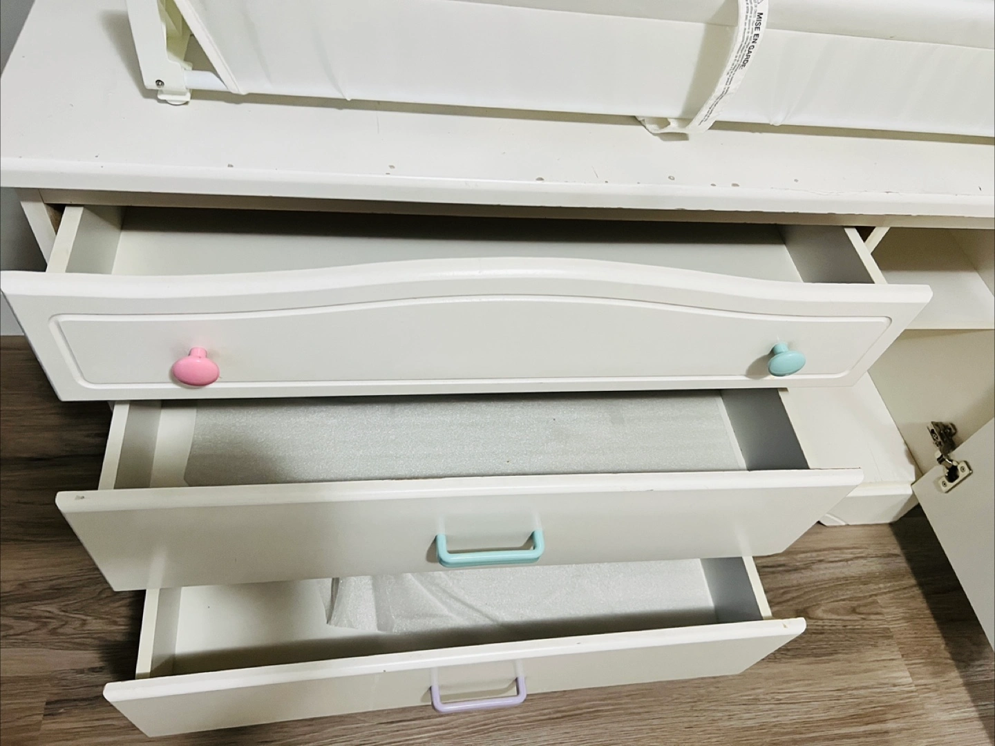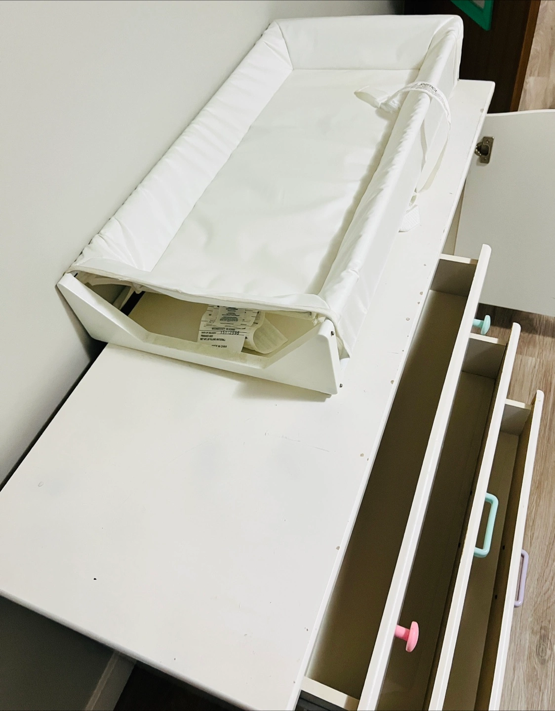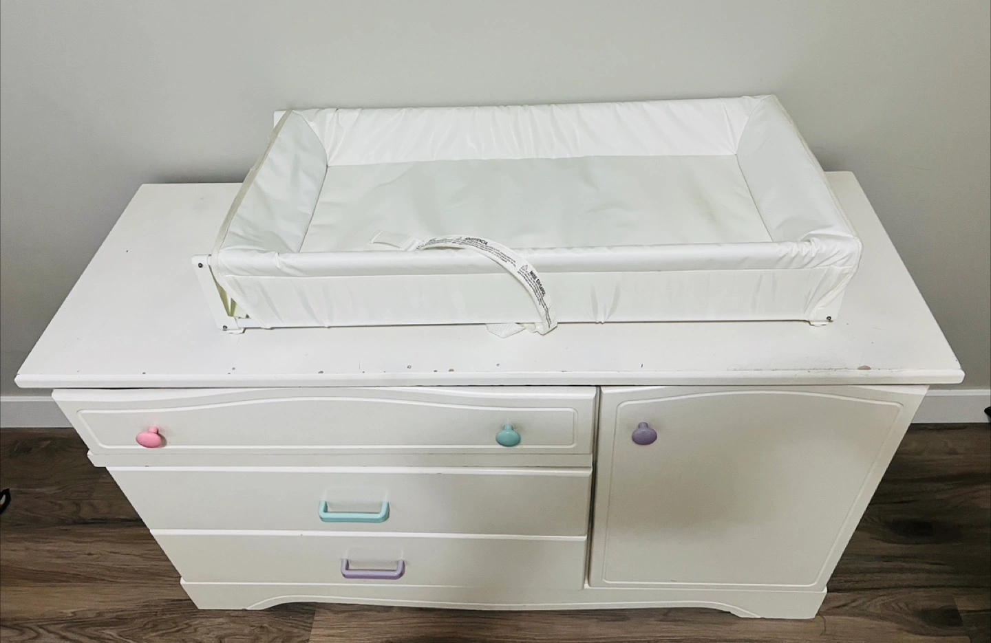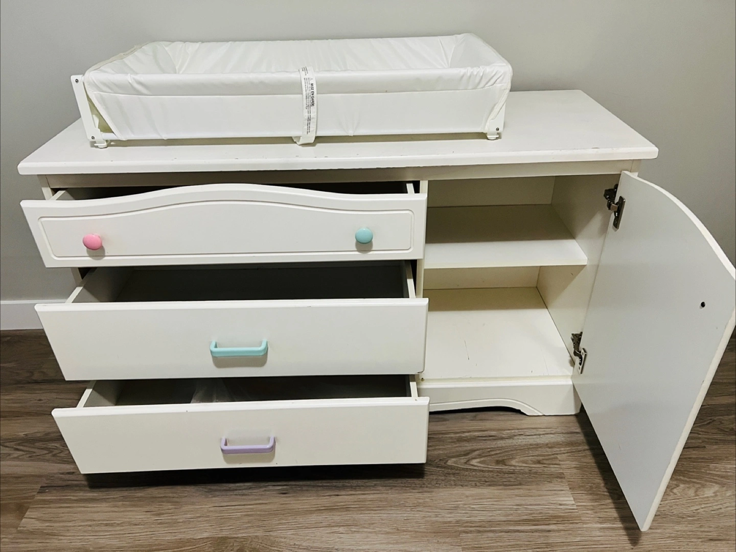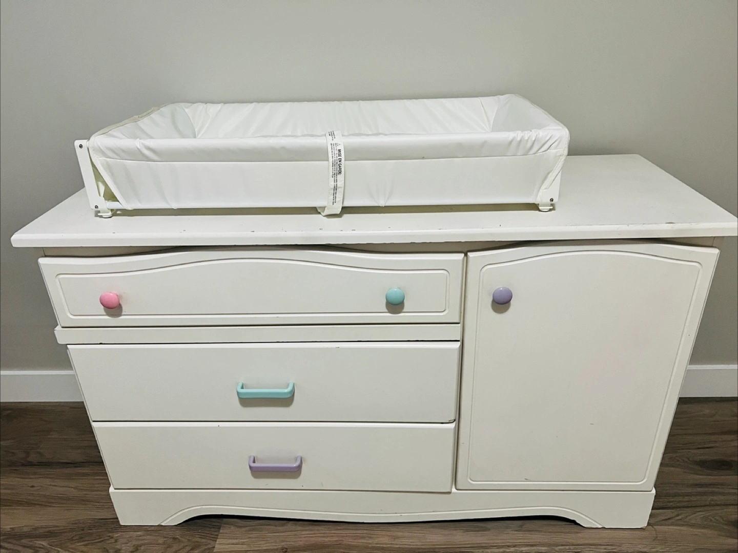 25White baby cabinet with changing pad. Comes with three drawers and a 2 shelves. Some minor wear and tear on top board only Measurement: 47.5x17x29 inches Pick up: Edgemont NW