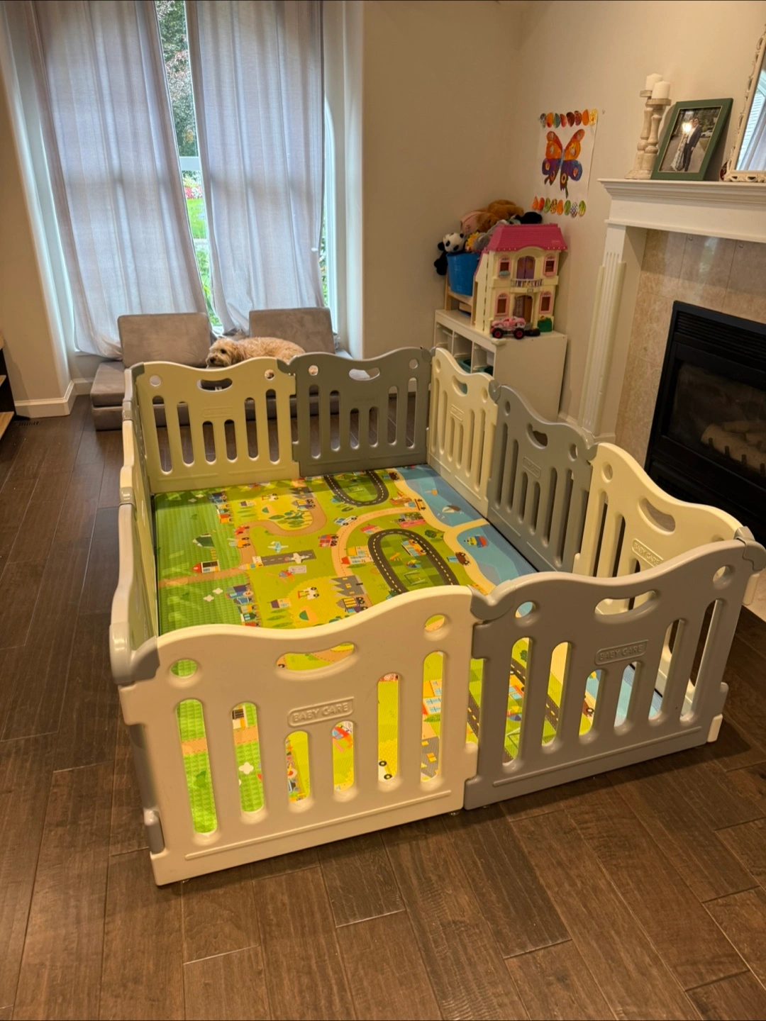 10Selling a Baby Care playpen that includes a play mat. It's in great condition and perfect for creating a safe play area for your little one. The play mat features a fun and colourful design with roads, cars, and buildings and reversible with letters on the other side.