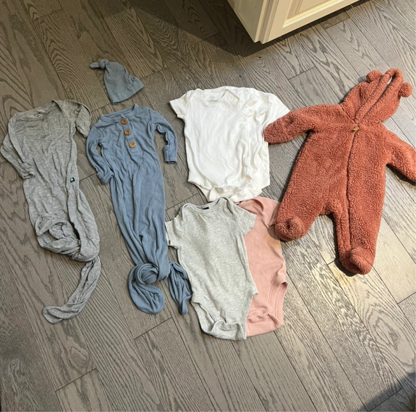 Selling a bundle of adorable baby clothes! Includes from left to right / top to bottom: Simple one size knotted sleeper (modal material, super soft, lasted me until 6M of age), Kyte Baby sleeper with hat (0-3M), George 0-3M onesies x 3 (small grey stain near neckline), Carters footed bunting suit (NB size but fits very big), and Old Navy onesies x2 (0-3M). Very good condition for most of the items.