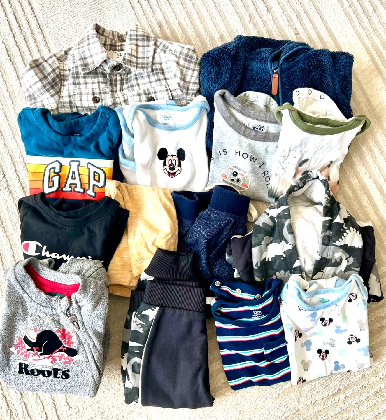 Selling a big bundle of baby clothes, perfect for your little one! Includes a variety of brands like Roots, Disney, Gap, Champion, and Star Wars. Sizes range around 6-12 months. There's a mix of onesies, shirts, pants, and a cozy Roots sweater. All in great condition and ready for a new home!